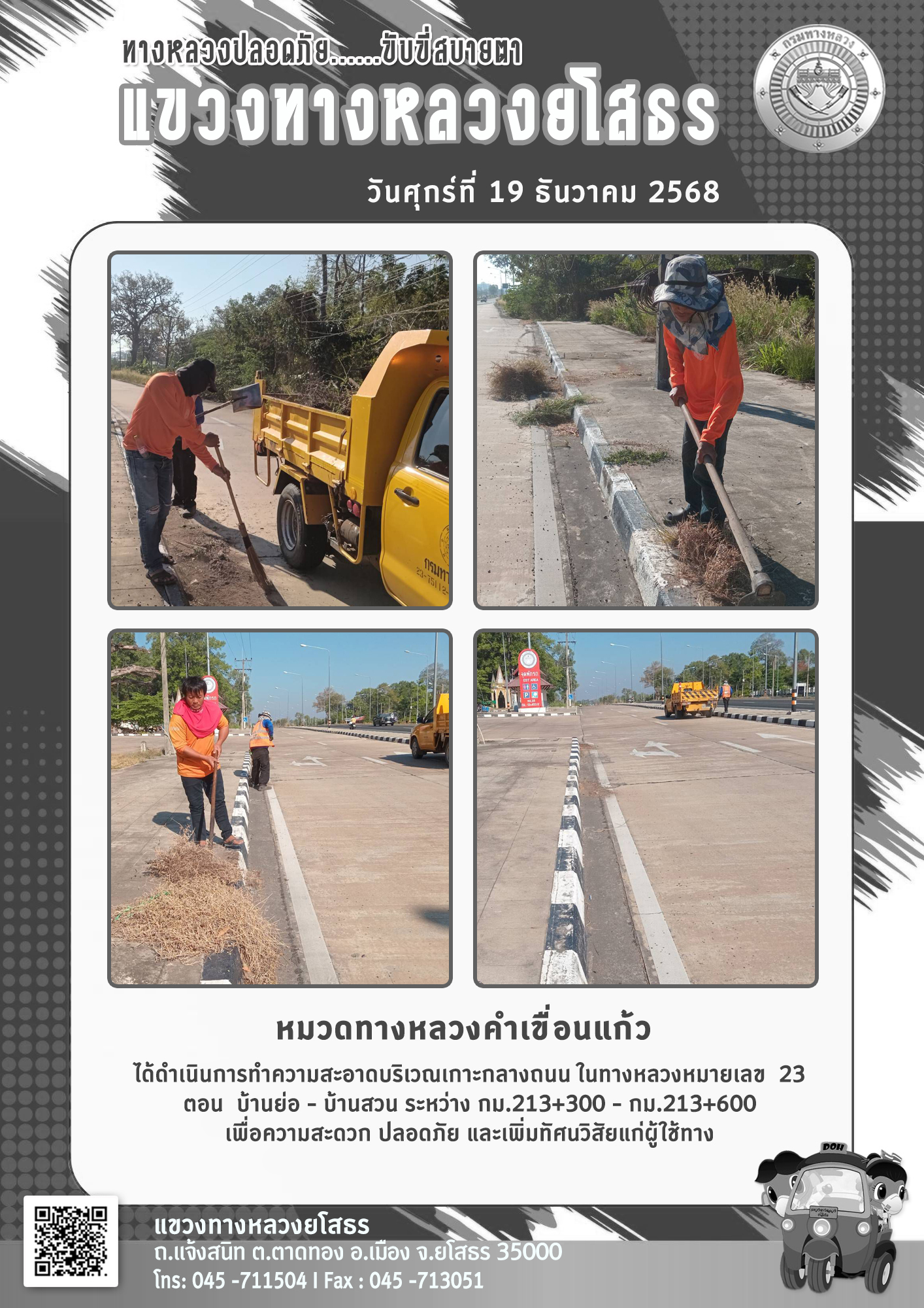 วันศุกร์ที่ 19 ธันวาคม 2568 หมวดทางหลวงคำเขื่อนแก้ว ได้ดำเนินการทำความสะอาดบริเวณเกาะกลางถนน ในทางหลวงหมายเลข 23 ตอน บ้านย่อ - บ้านสวน ระหว่าง กม.213+300 - กม.213+600 เพื่อความสะดวก ปลอดภัย และเพิ่มทัศนวิสัยแก่ผู้ใช้ทาง