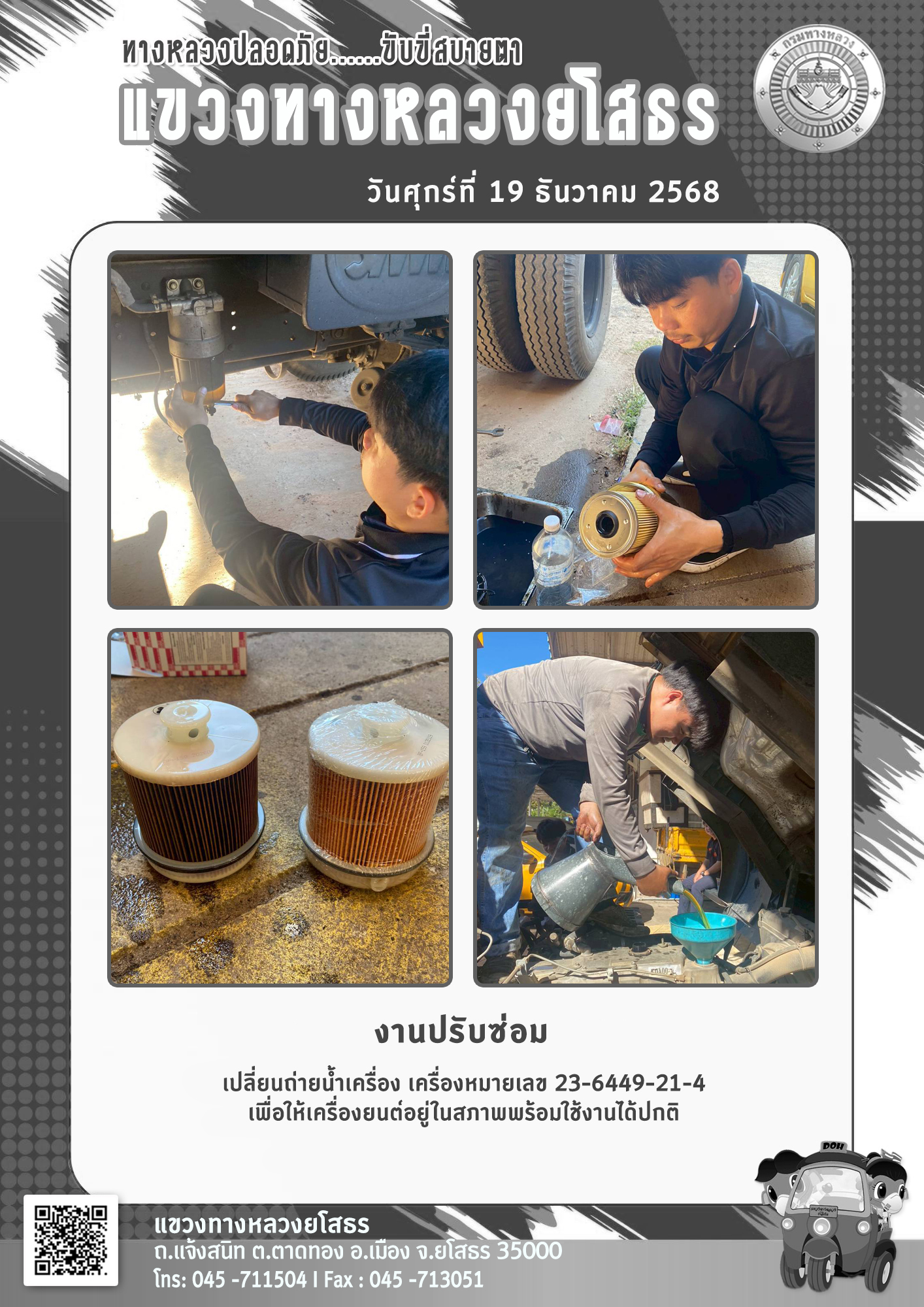 วันศุกร์ที่ 19 ธันวาคม 2568 งานปรับซ่อม เปลี่ยนถ่ายน้ำเครื่อง เครื่องหมายเลข 23-6449-21-4 เพื่อให้เครื่องยนต์อยู่ในสภาพพร้อมใช้งานได้ปกติ