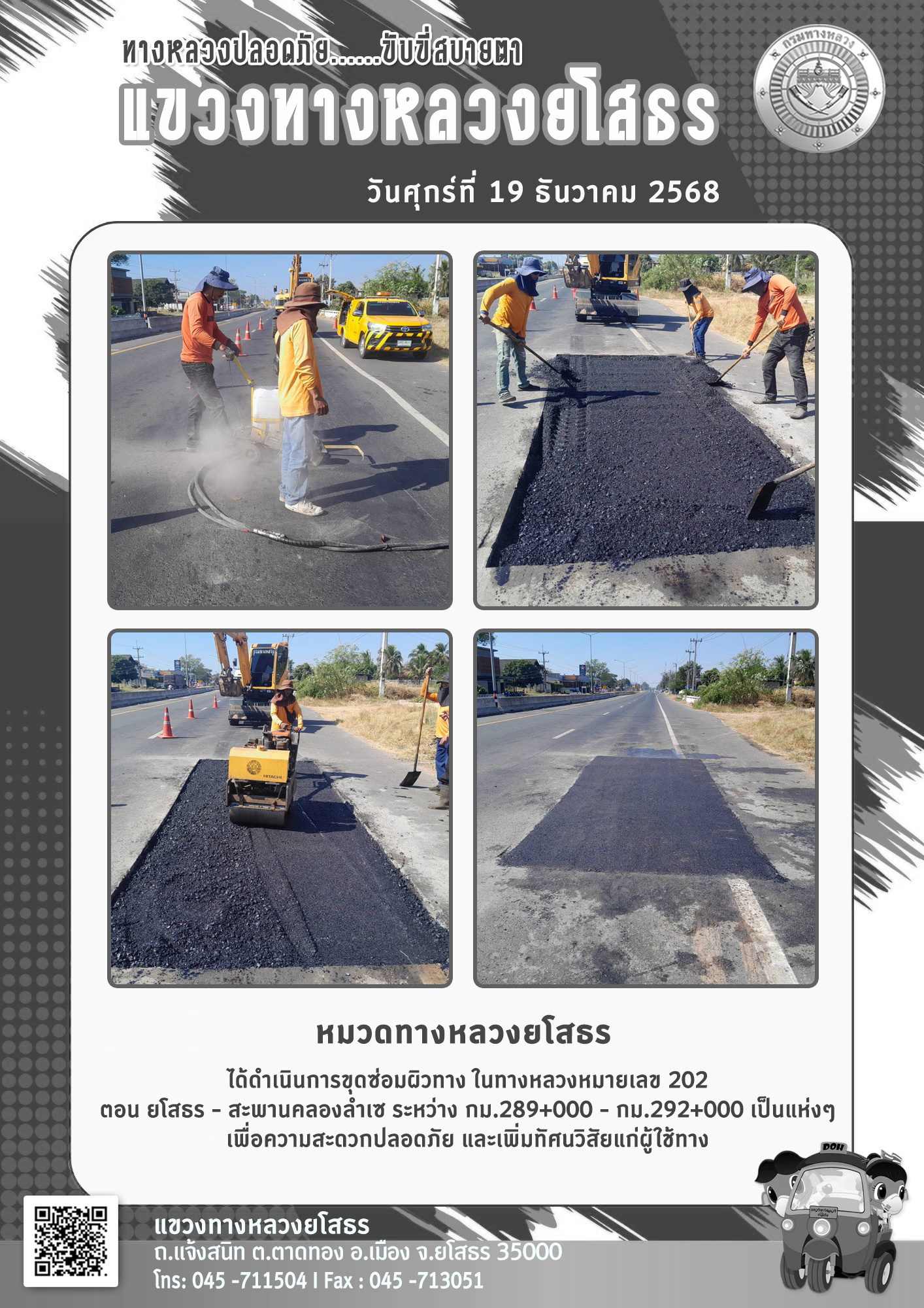 วันศุกร์ที่ 19 ธันวาคม 2568 หมวดทางหลวงยโสธร ได้ดำเนินการขุดซ่อมผิวทาง ในทางหลวงหมายเลข 202 ตอน ยโสธร - สะพานคลองลำเซ ระหว่าง กม.289+000 - กม.292+000 เป็นแห่งๆ เพื่อความสะดวกปลอดภัย และเพิ่มทัศนวิสัยแก่ผู้ใช้ทาง