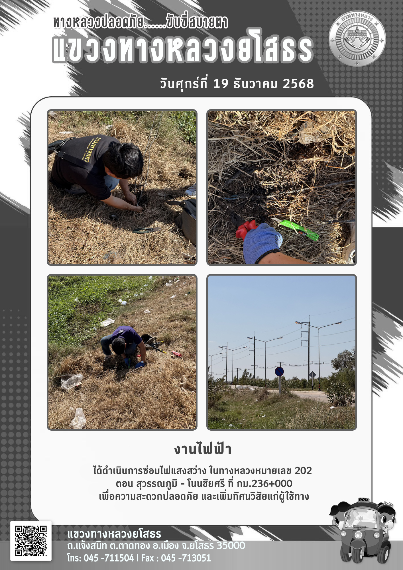 วันศุกร์ที่ 19 ธันวาคม 2568 งานไฟฟ้า ได้ดำเนินการซ่อมไฟแสงสว่าง ในทางหลวงหมายเลข 202 ตอน สุวรรณภูมิ - โนนชัยศรี ที่ กม.236+000 เพื่อความสะดวกปลอดภัย และเพิ่มทัศนวิสัยแก่ผู้ใช้ทาง