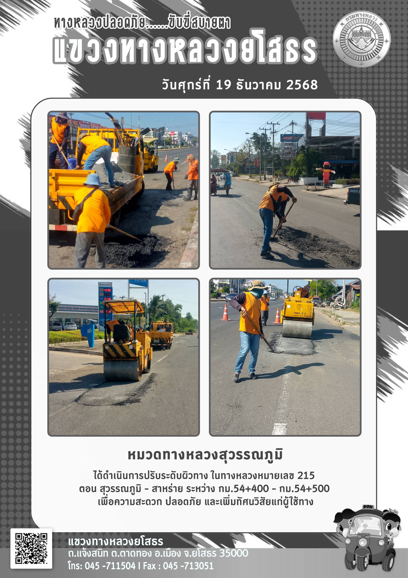 วันศุกร์ที่ 19 ธันวาคม 2568 หมวดทางหลวงสุวรรณภูมิ ได้ดำเนินการปรับระดับผิวทาง ในทางหลวงหมายเลข 215 ตอน สุวรรณภูมิ - สาหร่าย ระหว่าง กม.54+400 - กม.54+500 เพื่อความสะดวก ปลอดภัย และเพิ่มทัศนวิสัยแก่ผู้ใช้ทาง