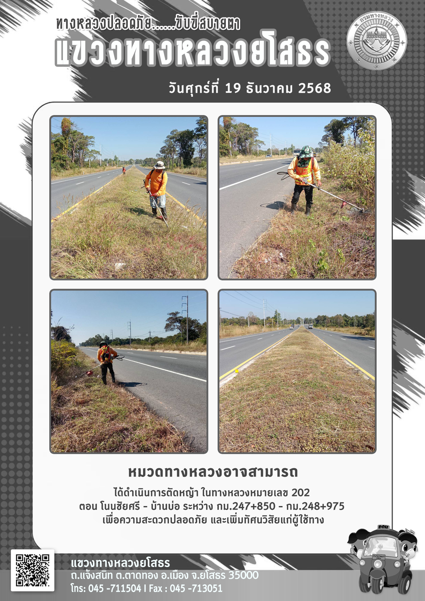 วันศุกร์ที่ 19 ธันวาคม 2568 หมวดทางหลวงอาจสามารถ ได้ดำเนินการตัดหญ้า ในทางหลวงหมายเลข 202 ตอน โนนชัยศรี - บ้านบ่อ ระหว่าง กม.247+850 - กม.248+975 เพื่อความสะดวกปลอดภัย และเพิ่มทัศนวิสัยแก่ผู้ใช้ทาง