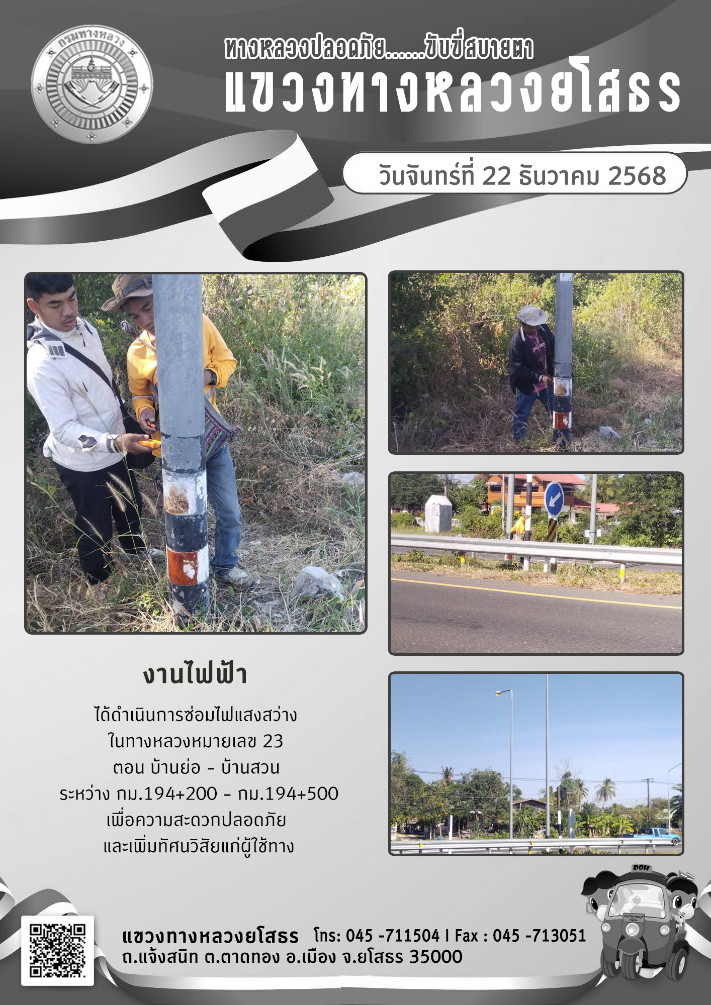 วันจันทร์ที่ 22 ธันวาคม 2568 งานไฟฟ้า ได้ดำเนินการซ่อมไฟแสงสว่าง ในทางหลวงหมายเลข 23 ตอน บ้านย่อ - บ้านสวน ระหว่าง กม.194+200 - กม.194+500 เพื่อความสะดวกปลอดภัย และเพิ่มทัศนวิสัยแก่ผู้ใช้ทาง
