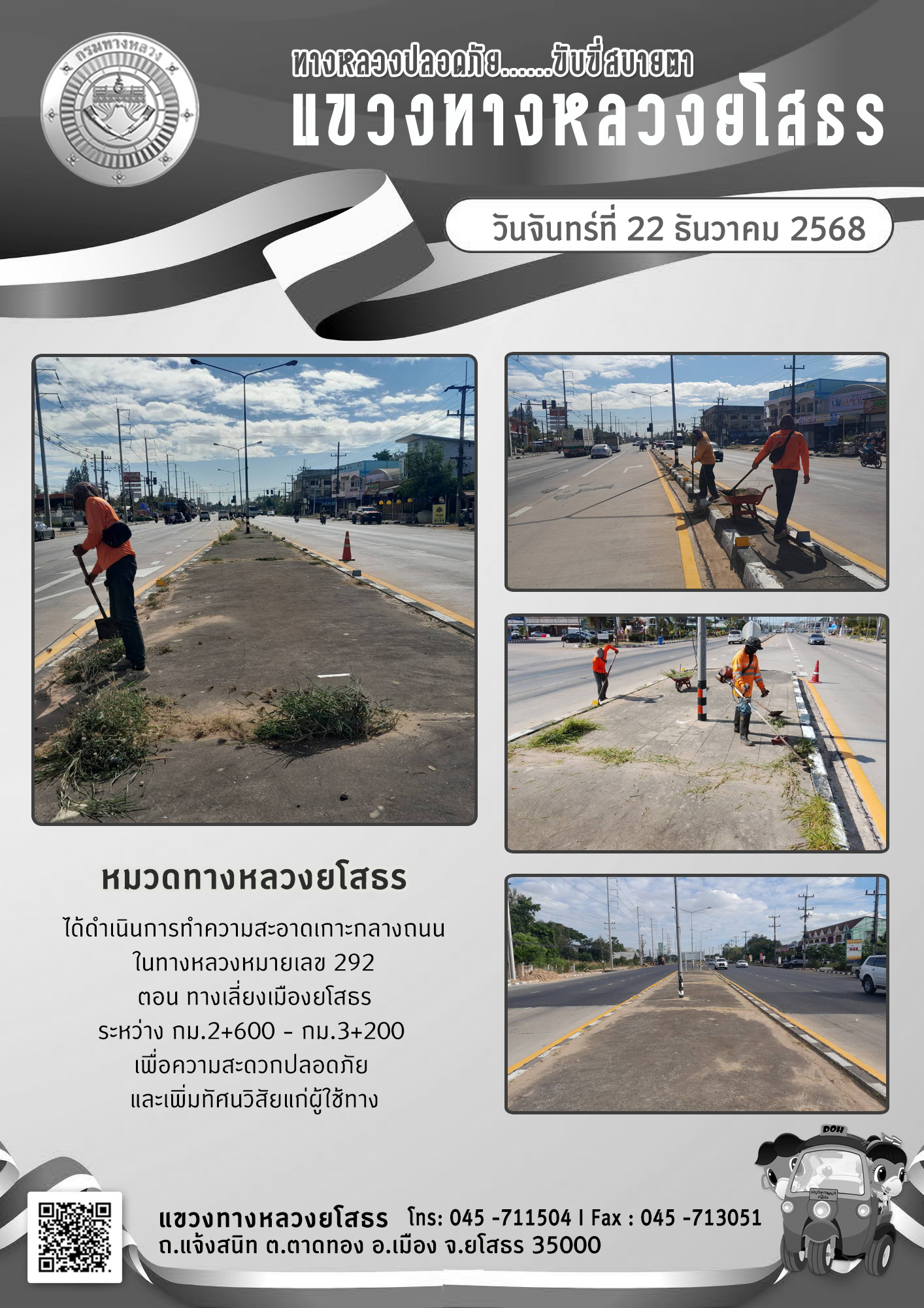 วันจันทร์ที่ 22 ธันวาคม 2568 หมวดทางหลวงยโสธร ได้ดำเนินการทำความสะอาดเกาะกลางถนน ในทางหลวงหมายเลข 292 ตอน ทางเลี่ยงเมืองยโสธร ระหว่าง กม.2+600 - กม.3+200 เพื่อความสะดวกปลอดภัย และเพิ่มทัศนวิสัยแก่ผู้ใช้ทาง