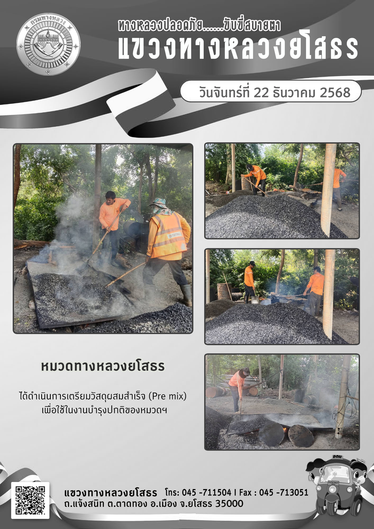 วันจันทร์ที่ 22 ธันวาคม 2568 หมวดทางหลวงยโสธร ได้ดำเนินการเตรียมวัสดุผสมสำเร็จ (Pre mix) เพื่อใช้ในงานบำรุงปกติของหมวดฯ