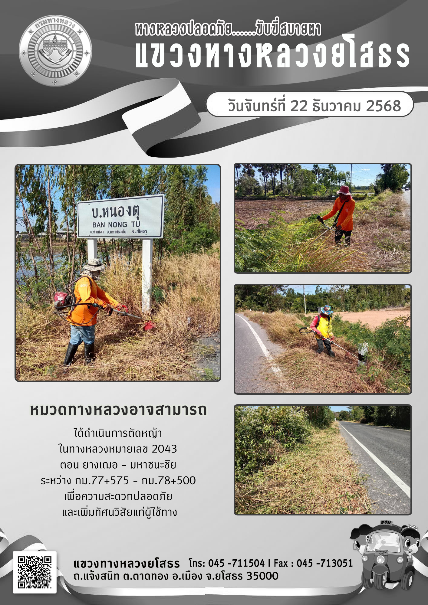 วันจันทร์ที่ 22 ธันวาคม 2568 หมวดทางหลวงอาจสามารถ ได้ดำเนินการตัดหญ้า ในทางหลวงหมายเลข 2043 ตอน ยางเฌอ - มหาชนะชัย ระหว่าง กม.77+575 - กม.78+500 เพื่อความสะดวกปลอดภัย และเพิ่มทัศนวิสัยแก่ผู้ใช้ทาง