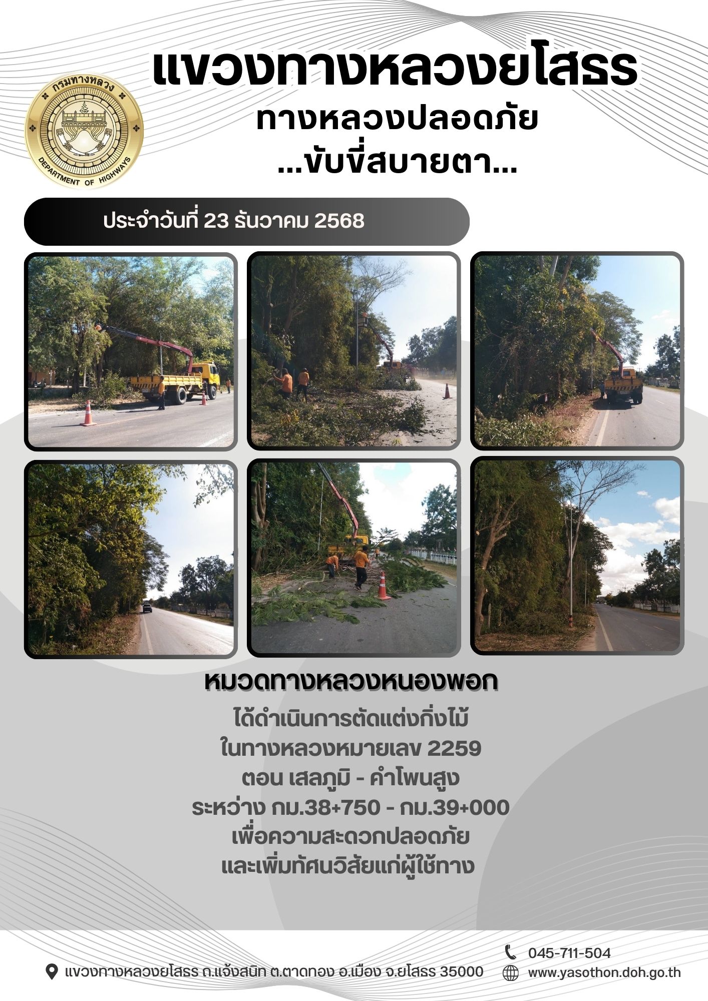 วันที่ 23 ธันวาคม 2568 หมวดทางหลวงหนองพอก ได้ดำเนินการตัดแต่งกิ่งไม้ ในทางหลวงหมายเลข 2259 ตอน เสลภูมิ - คำโพนสูง ระหว่าง กม.38+750 - กม.39+000 เพื่อความสะดวกปลอดภัย และเพิ่มทัศนวิสัยแก่ผู้ใช้ทาง