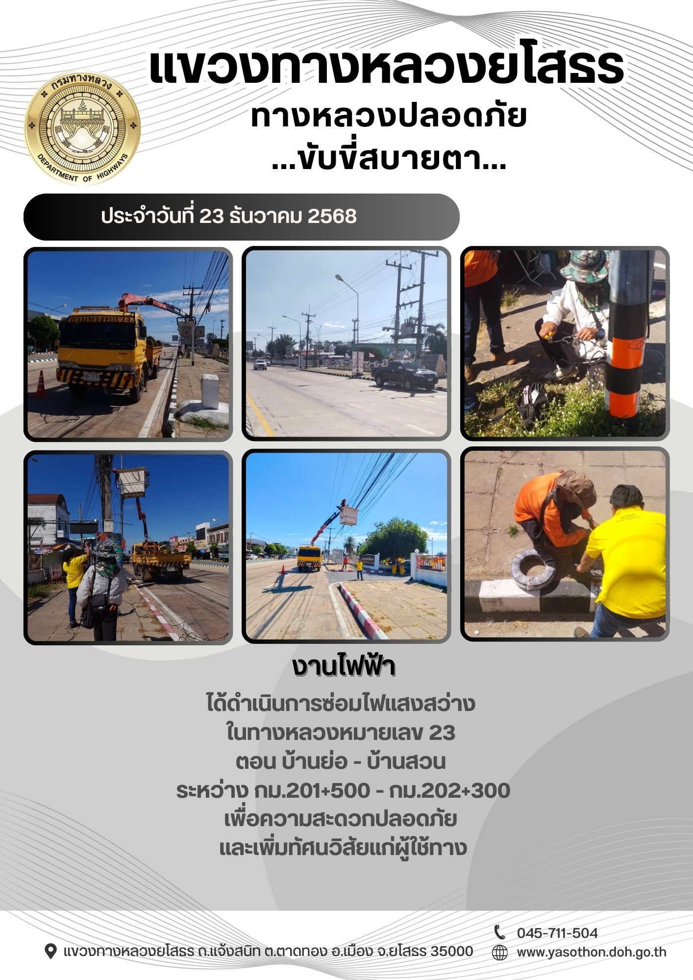 วันที่ 23 ธันวาคม 2568 งานไฟฟ้า ได้ดำเนินการซ่อมไฟแสงสว่าง ในทางหลวงหมายเลข 23 ตอน บ้านย่อ - บ้านสวน ระหว่าง กม.201+500 - กม.202+300 เพื่อความสะดวกปลอดภัย และเพิ่มทัศนวิสัยแก่ผู้ใช้ทาง