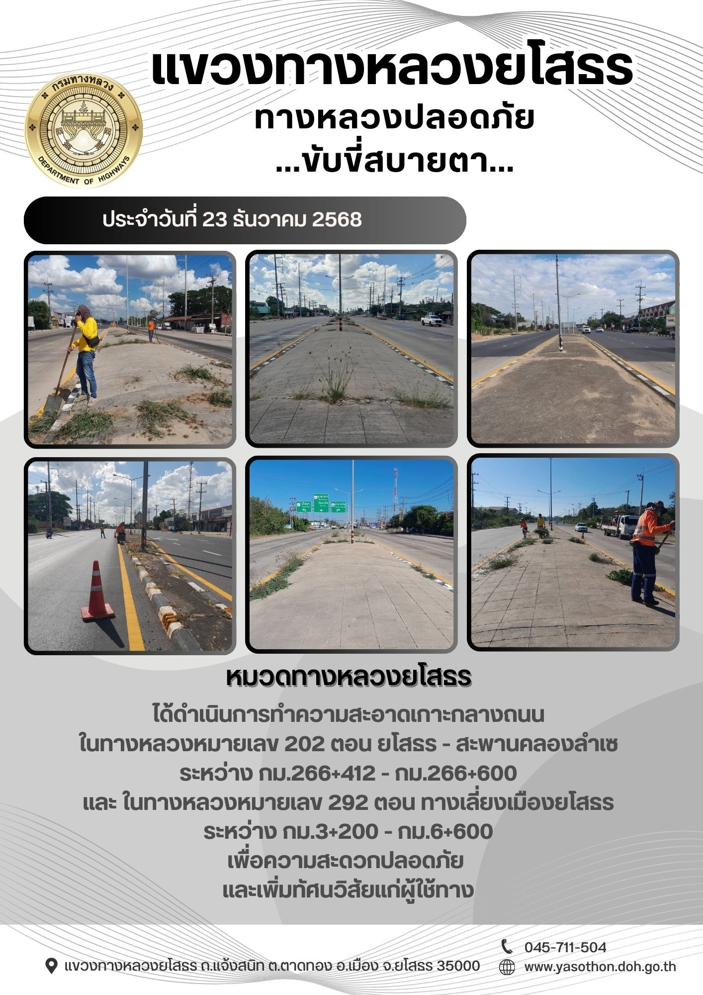 วันที่ 23 ธันวาคม 2568 หมวดทางหลวงยโสธร ได้ดำเนินการทำความสะอาดเกาะกลางถนน ในทางหลวงหมายเลข 202 ตอน ยโสรร - สะพานคลองลำเซ ระหว่าง กม.266+412 - กม.266+600 และทางหลวงหมายเลข 292 ตอน ทางเลี่ยงเมืองยโสรร ระหว่าง กม.3+200 - กม.6+600 เพื่อความสะดวกปลอดภัย