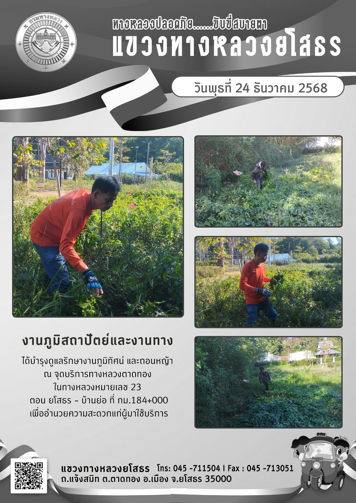 วันพุธที่ 24 ธันวาคม 2568 งานภูมิสถาปัตย์และงานทาง ได้บำรุงดูแลรักษางานภูมิทัศน์ และถอนหญ้า ณ จุดบริการทางหลวงตาดทอง ในทางหลวงหมายเลข 23 ตอน ยโสธร - บ้านย่อ ที่ กม.184+000 เพื่ออำนวยความสะดวกแก่ผู้มาใช้บริการ