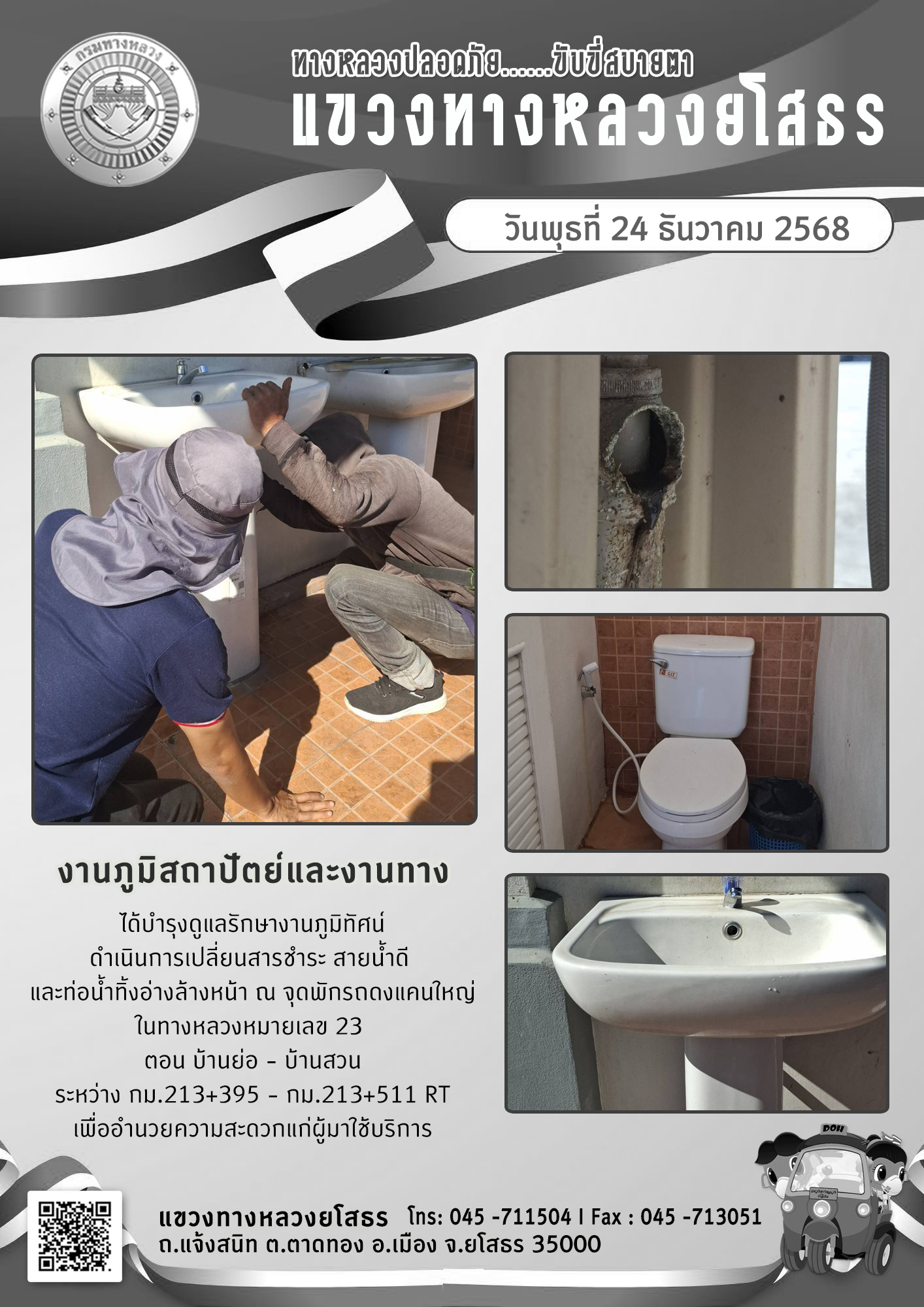 วันพุธที่ 24 ธันวาคม 2568 งานภูมิสถาปัตย์และงานทาง ได้บำรุงดูแลรักษางานภูมิทัศน์ ดำเนินการเปลี่ยนสายชำระ และท่อน้ำทิ้งอ่างล้างหน้า ณ จุดพักรถดงแคนใหญ่ ในทางหลวงหมายเลข 23 ตอน บ้านย่อ - บ้านสวน ระหว่าง กม.213+395 - กม.213+511 RT เพื่ออำนวยความสะดวกแก่