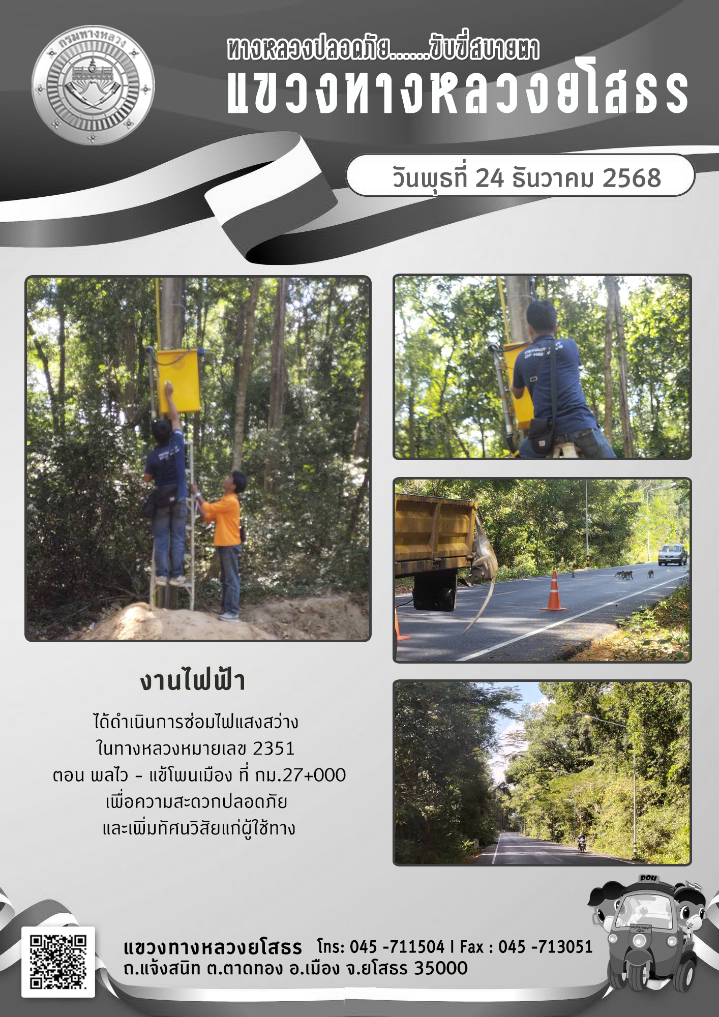 วันพุธที่ 24 ธันวาคม 2568 งานไฟฟ้า ได้ดำเนินการซ่อมไฟแสงสว่าง ในทางหลวงหมายเลข 2351 ตอน พลไว - แข้โพนเมือง ที่ กม.27+000 เพื่อความสะดวกปลอดภัย และเพิ่มทัศนวิสัยแก่ผู้ใช้ทาง