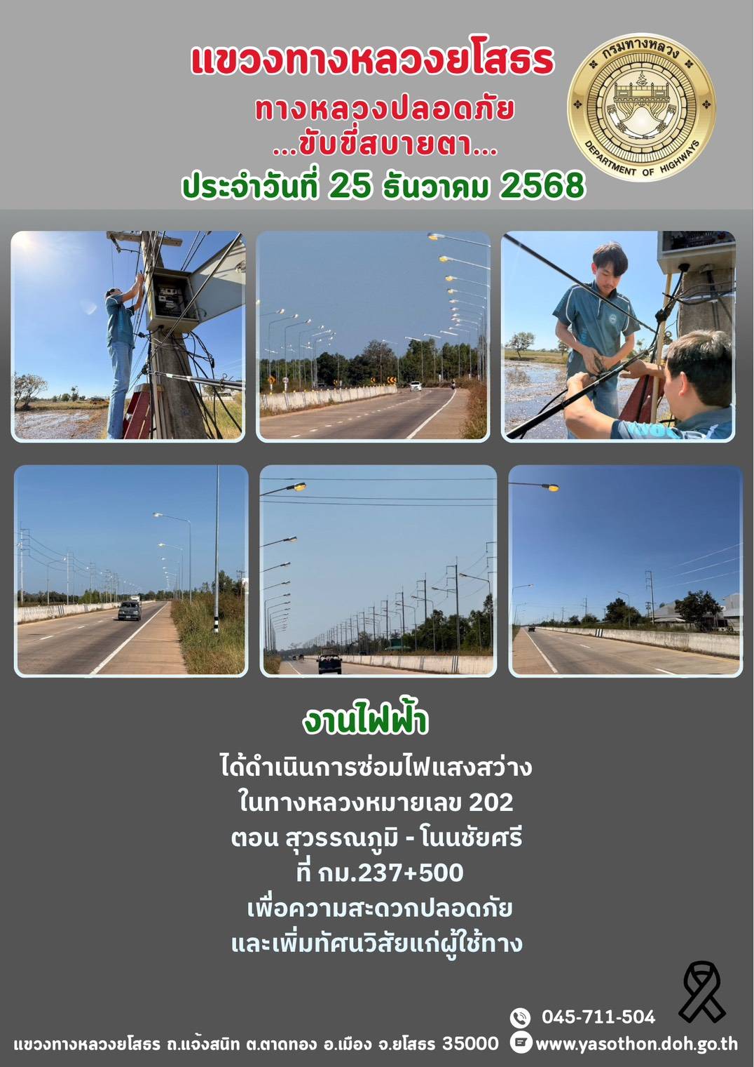 วันที่ 25 ธันวาคม 2568 งานไฟฟ้า ได้ดำเนินการซ่อมไฟแสงสว่าง ในทางหลวงหมายเลข 202 ตอน สุวรรณภูมิ - โนนชัยศรี ที่ กม.237+500 เพื่อความสะดวกปลอดภัย และเพิ่มทัศนวิสัยแก่ผู้ใช้ทาง