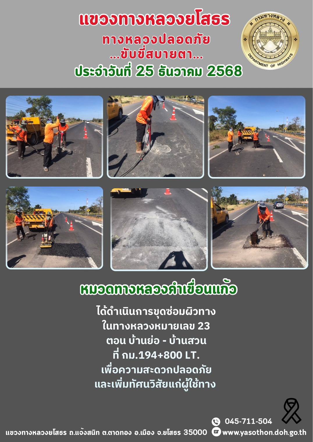 วันที่ 25 ธันวาคม 2568 หมวดทางหลวงคำเขื่อนแก้ว ได้ดำเนินการขุดซ่อมผิวทาง ในทางหลวงหมายเลข 23 ตอน บ้านย่อ - บ้านสวน ที่ กม.194+800 LT. เพื่อความสะดวกปลอดภัย และเพิ่มทัศนวิสัยแก่ผู้ใช้ทาง