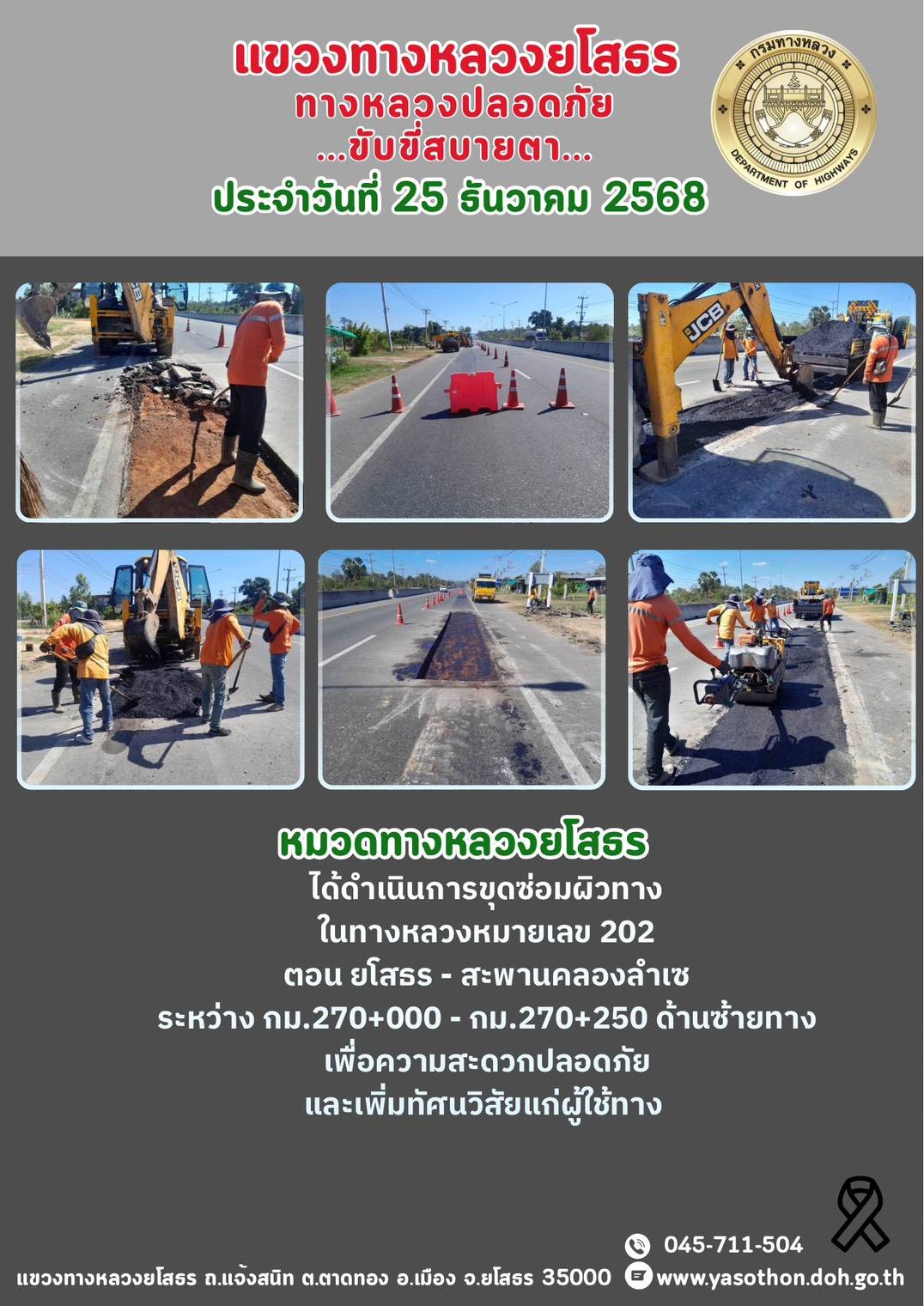 วันที่ 25 ธันวาคม 2568 หมวดทางหลวงยโสธร ได้ดำเนินการขุดซ่อมผิวทาง ในทางหลวงหมายเลข 202 ตอน ยโสธร - สะพานคลองลำเซ ระหว่าง กม.270+000 - กม.270+250 ด้านซ้ายทาง เพื่อความสะดวกปลอดภัย และเพิ่มทัศนวิสัยแก่ผู้ใช้ทาง