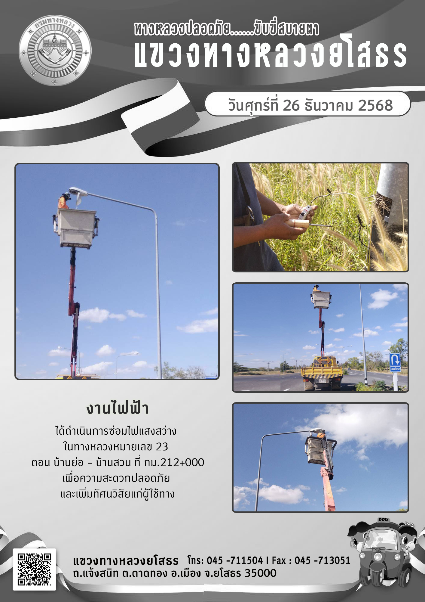 วันศุกร์ที่ 26 ธันวาคม 2568 งานไฟฟ้า ได้ดำเนินการซ่อมไฟแสงสว่าง ในทางหลวงหมายเลข 23 ตอน บ้านย่อ - บ้านสวน ที่ กม.212+000 เพื่อความสะดวกปลอดภัย และเพิ่มทัศนวิสัยแก่ผู้ใช้ทาง