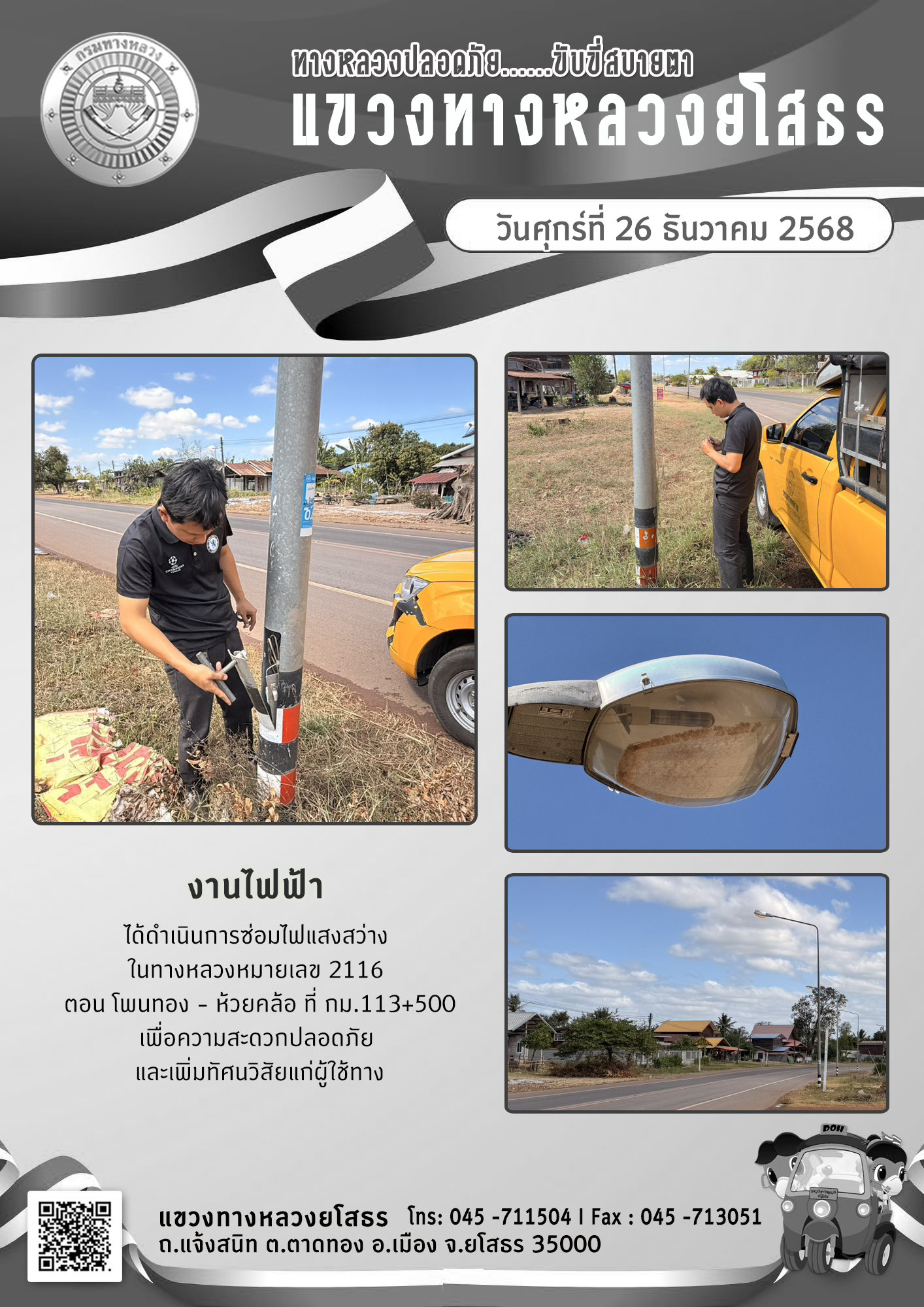 วันศุกร์ที่ 26 ธันวาคม 2568 งานไฟฟ้า ได้ดำเนินการซ่อมไฟแสงสว่าง ในทางหลวงหมายเลข 2116 ตอน โพนทอง - หัวยคล้อ ที่ กม.113+500 เพื่อความสะดวกปลอดภัย และเพิ่มทัศนวิสัยแก่ผู้ใช้ทาง