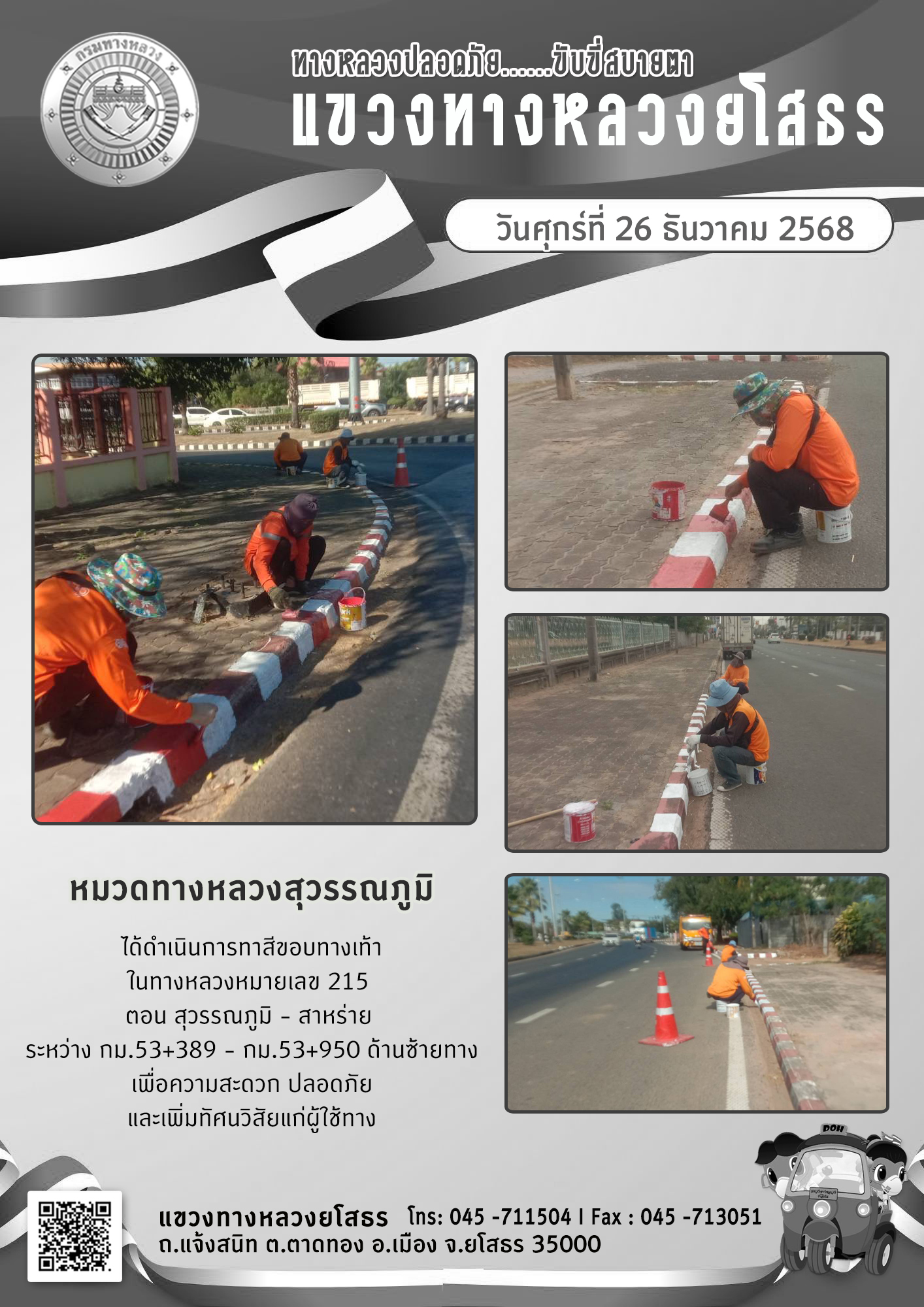 วันศุกร์ที่ 26 ธันวาคม 2568 หมวดทางหลวงสุวรรณภูมิ ได้ดำเนินการทาสีขอบทางเท้า ในทางหลวงหมายเลข 215 ตอน สุวรรณภูมิ - สาหร่าย ระหว่าง กม.53+389 - กม.53+950 ด้านซ้ายทาง เพื่อความสะดวก ปลอดภัย และเพิ่มทัศนวิสัยแก่ผู้ใช้ทาง