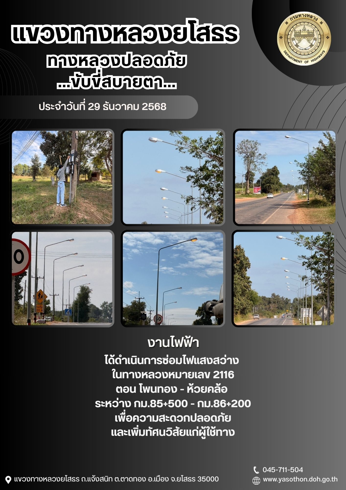 วันที่ 29 ธันวาคม 2568 งานไฟฟ้า ได้ดำเนินการซ่อมไฟแสงสว่าง ในทางหลวงหมายเลข 2116 ตอน โพนทอง - ห้วยคล้อ ระหว่าง กม.85+500 - กม.86+200 เพื่อความสะดวกปลอดภัย และเพิ่มทัศนวิสัยแก่ผู้ใช้ทาง