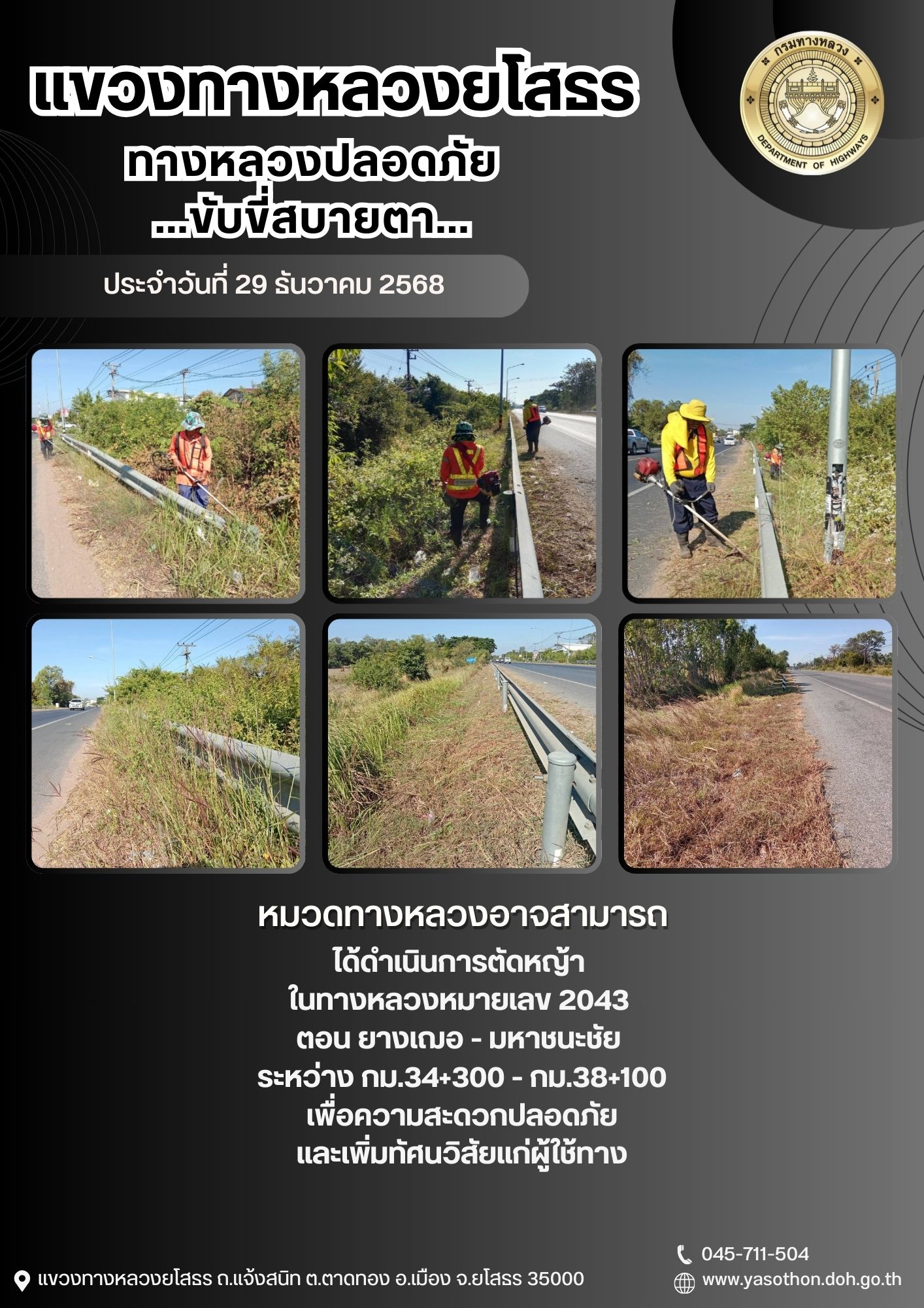 วันที่ 29 ธันวาคม 2568 หมวดทางหลวงอาจสามารถ ได้ดำเนินการตัดหญ้า ในทางหลวงหมายเลข 2043 ตอน ยางเฌอ - มหาชนะชัย ระหว่าง กม.34+300 - กม.38+100 เพื่อความสะดวกปลอดภัย และเพิ่มทัศนวิสัยแก่ผู้ใช้ทาง