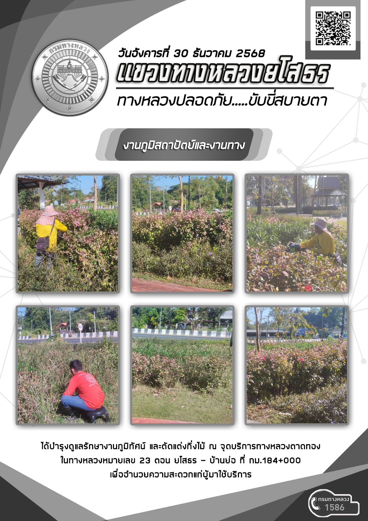 วันอังคารที่ 30 ธันวาคม 2568 งานภูมิสถาปัตย์และงานทาง ได้บำรุงดูแลรักษางานภูมิทัศน์ และตัดแต่งกิ่งไม้ ณ จุดบริการทางหลวงตาดทอง ในทางหลวงหมายเลข 23 ตอน ยโสธร - บ้านย่อ ที่ กม.184+000 เพื่ออำนวยความสะดวกแก่ผู้มาใช้บริการ