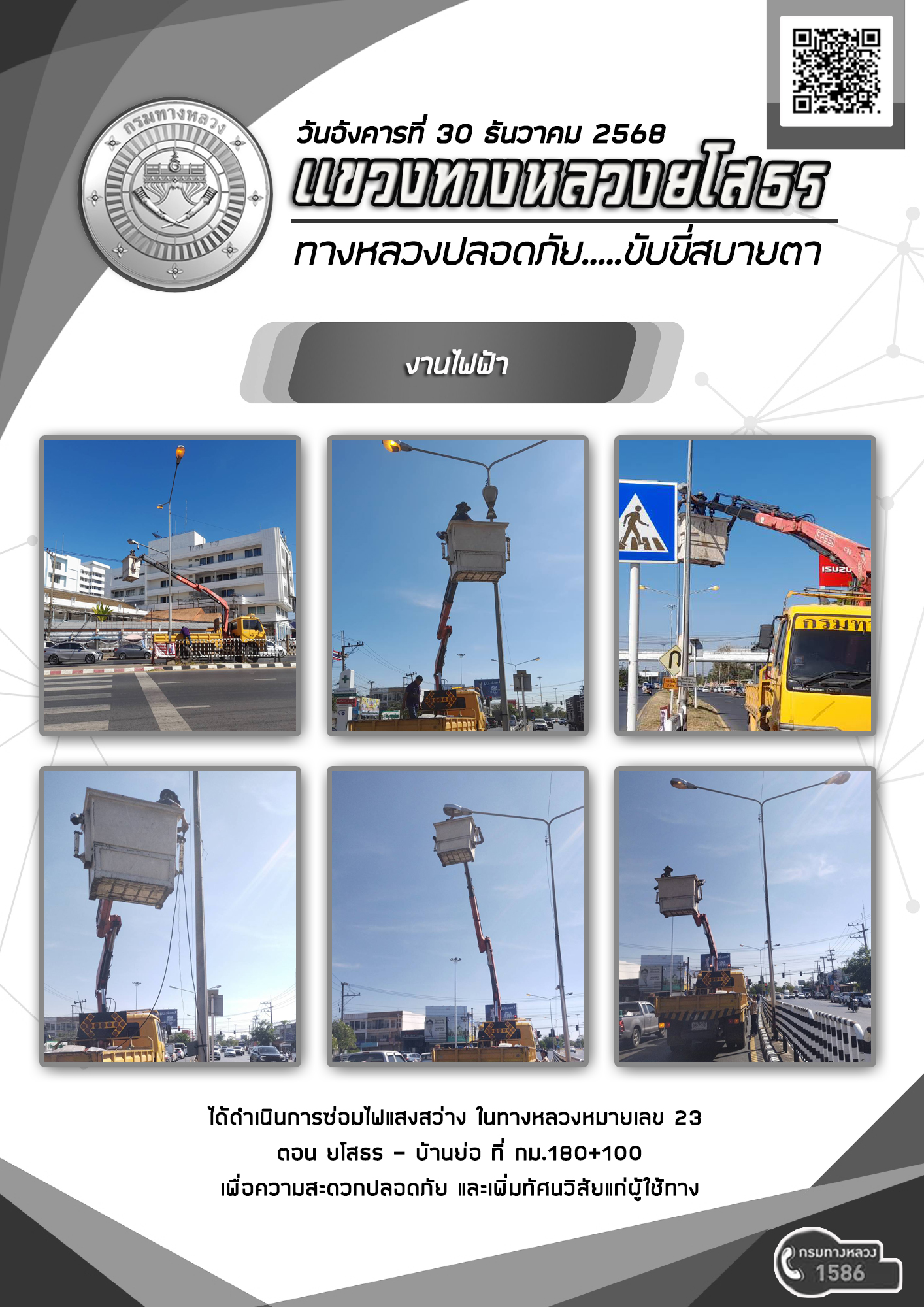 วันอังคารที่ 30 ธันวาคม 2568 งานไฟฟ้า ได้ดำเนินการซ่อมไฟแสงสว่าง ในทางหลวงหมายเลข 23 ตอน ยโสธร - บ้านย่อ ที่ กม.180+100 เพื่อความสะดวกปลอดภัย และเพิ่มทัศนวิสัยแก่ผู้ใช้ทาง