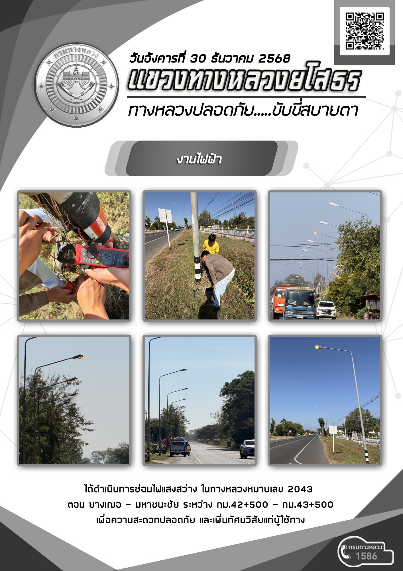 วันอังคารที่ 30 ธันวาคม 2568 งานไฟฟ้า ได้ดำเนินการซ่อมไฟแสงสว่าง ในทางหลวงหมายเลข 2043 ตอน ยางเฌอ - มหาชนะชัย ระหว่าง กม.42+500 - กม.43+500 เพื่อความสะดวกปลอดภัย และเพิ่มทัศนวิสัยแก่ผู้ใช้ทาง