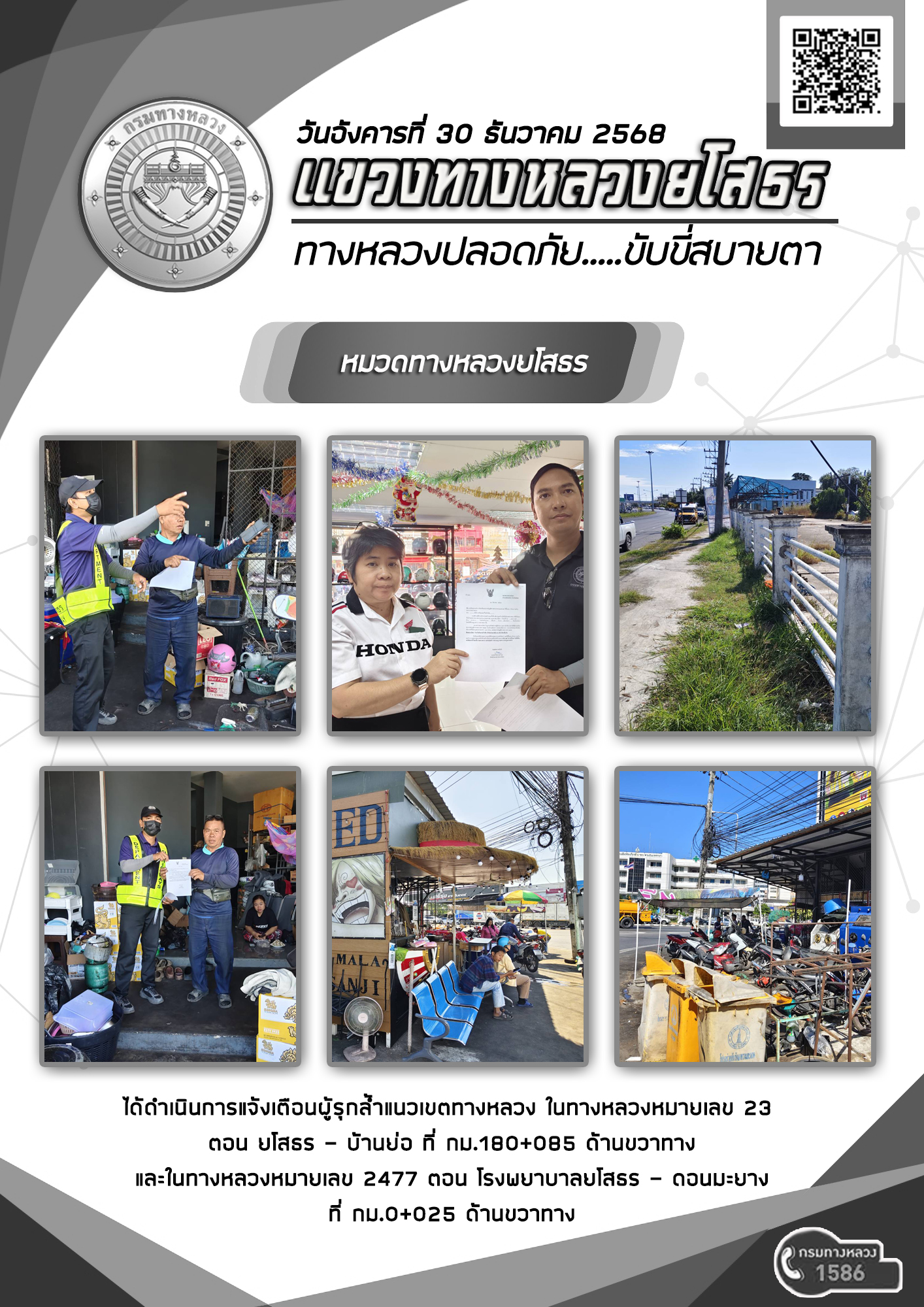 วันอังคารที่ 30 ธันวาคม 2568 หมวดทางหลวงยโสธร ได้ดำเนินการแจ้งเตือนผู้รุกล้ำแนวเขตทางหลวง ในทางหลวงหมายเลข 23 ตอน ยโสธร - บ้านย่อ ที่ กม.180+085 ด้านขวาทาง และในทางหลวงหมายเลข 2477 ตอน โรงพยาบาลยโสธร - ดอนมะยาง ที่ กม.0+025 ด้านขวาทาง