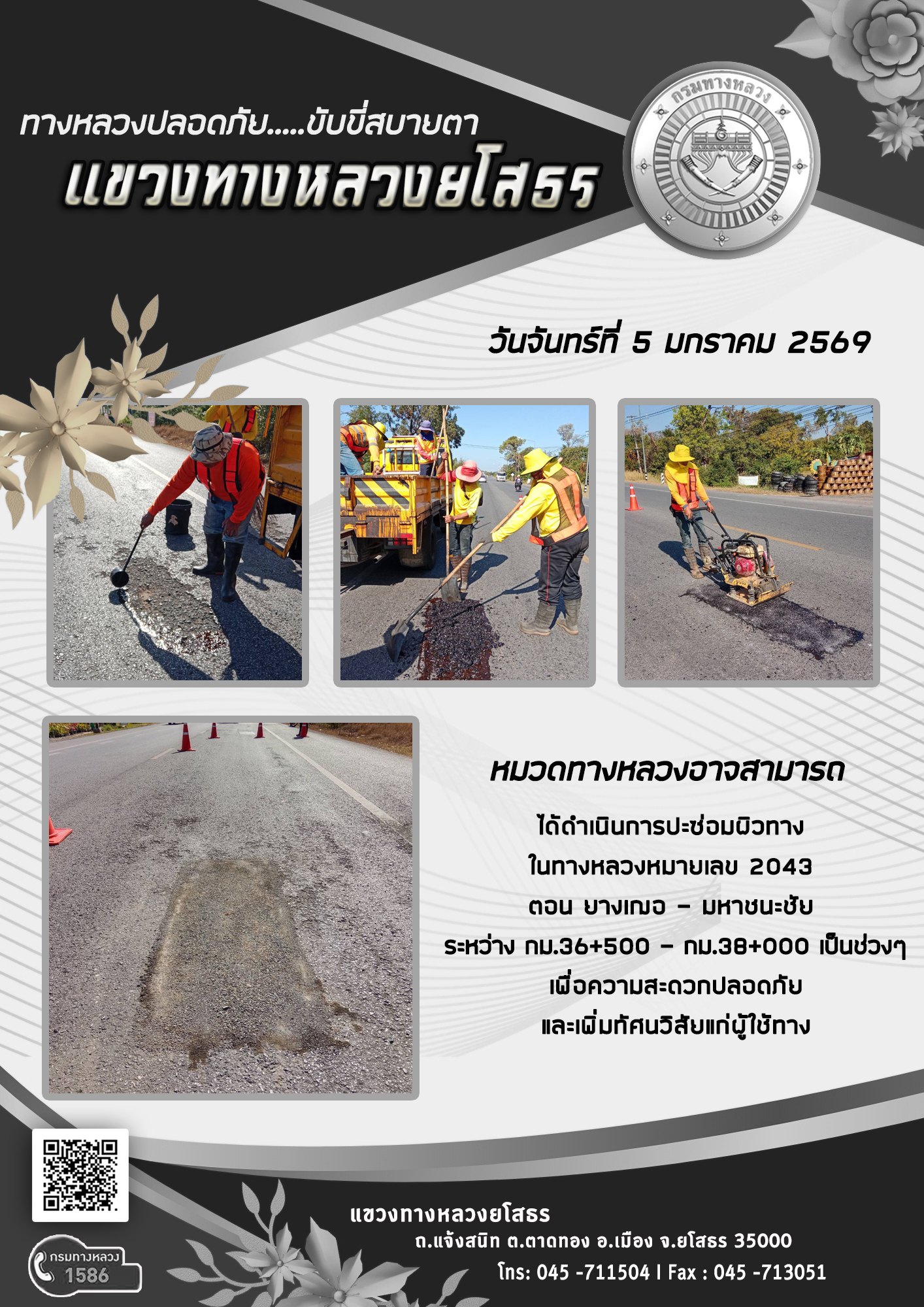 วันจันทร์ที่ 5 มกราคม 2569 หมวดทางหลวงอาจสามารถ ได้ดำเนินการปะซ่อมผิวทาง ในทางหลวงหมายเลข 2043 ตอน ยางเฌอ - มหาชนะชัย ระหว่าง กม.36+500 - กม.38+000 เป็นช่วงๆ เพื่อความสะดวกปลอดภัย และเพิ่มทัศนวิสัยแก่ผู้ใช้ทาง