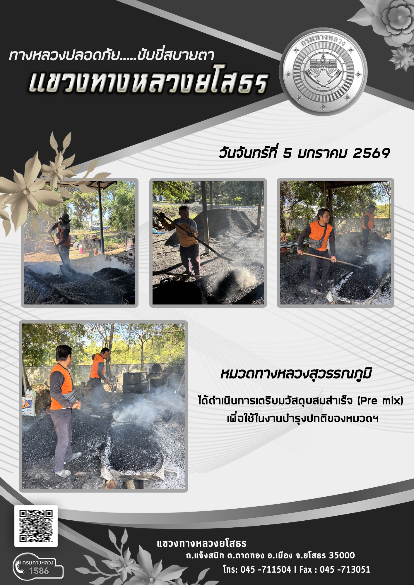 วันจันทร์ที่ 5 มกราคม 2569 หมวดทางหลวงสุวรรณภูมิ ได้ดำเนินการเตรียมวัสดุผสมสำเร็จ (Pre mix) เพื่อใช้ในงานบำรุงปกติของหมวดฯ