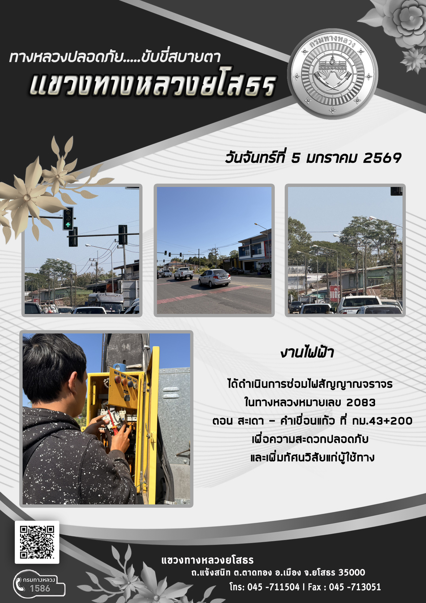 วันจันทร์ที่ 5 มกราคม 2569 งานไฟฟ้า ได้ดำเนินการซ่อมไฟสัญญาณจราจร ในทางหลวงหมายเลข 2083 ตอน สะเดา - คำเขื่อนแก้ว ที่ กม.43+200 เพื่อความสะดวกปลอดภัย และเพิ่มทัศนวิสัยแก่ผู้ใช้ทาง