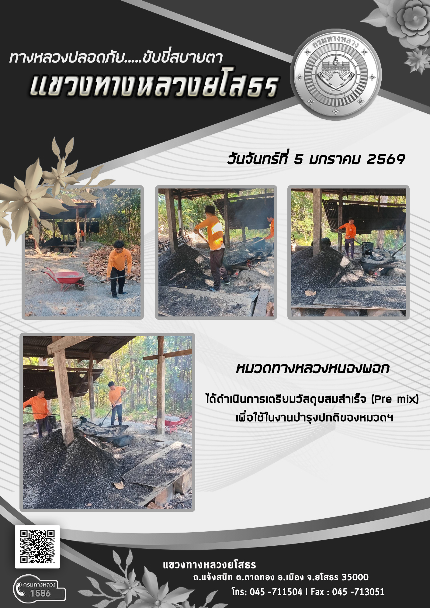 วันจันทร์ที่ 5 มกราคม 2569 หมวดทางหลวงหนองพอก ได้ดำเนินการเตรียมวัสดุผสมสำเร็จ (Pre mix) เพื่อใช้ในงานบำรุงปกติของหมวดฯ