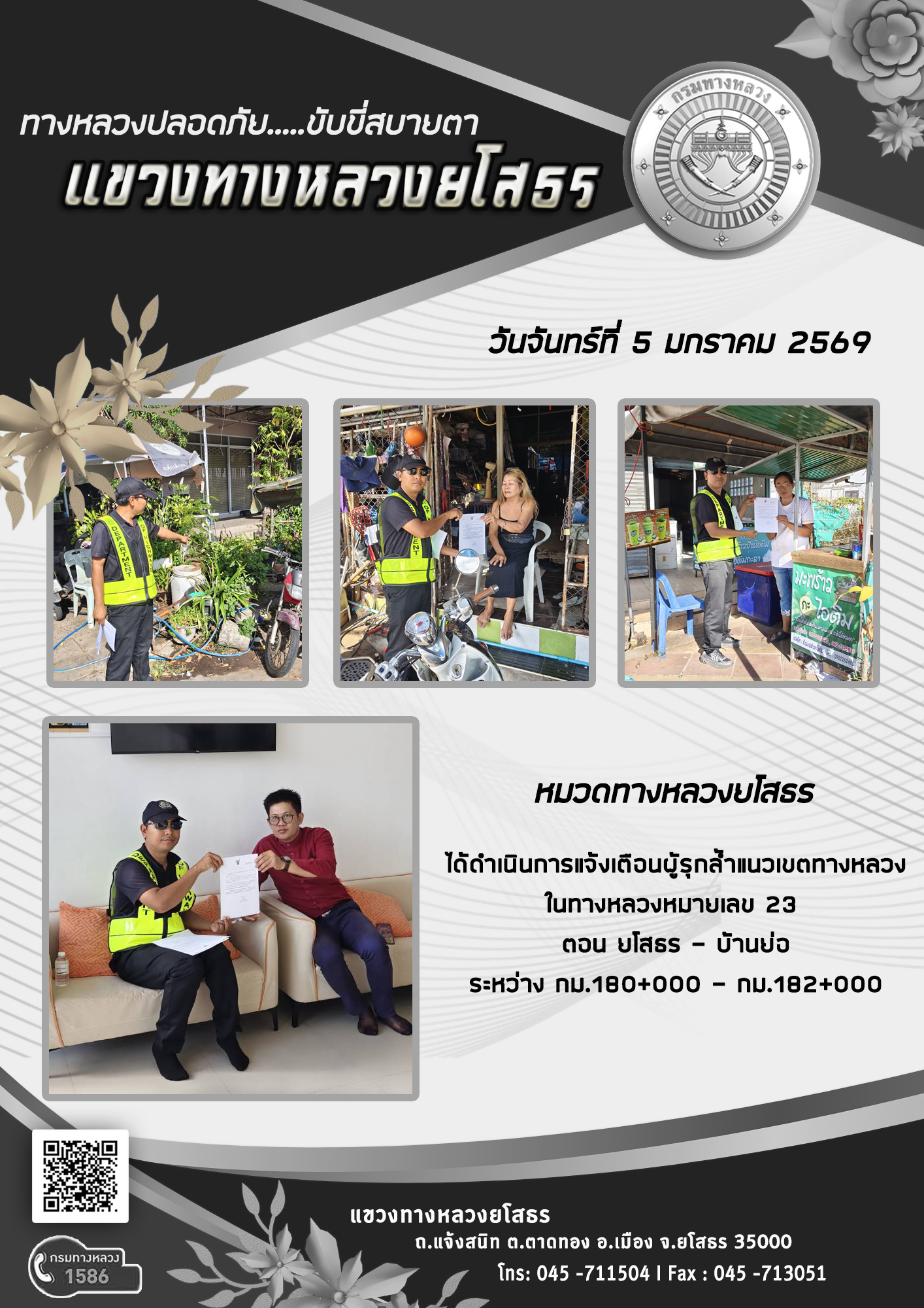 วันจันทร์ที่ 5 มกราคม 2569 หมวดทางหลวงยโสธร ได้ดำเนินการแจ้งเตือนผู้รุกล้ำแนวเขตทางหลวง ในทางหลวงหมายเลข 23 ตอน ยโสธร - บ้านย่อ ระหว่าง กม.180+000 - กม.182+000