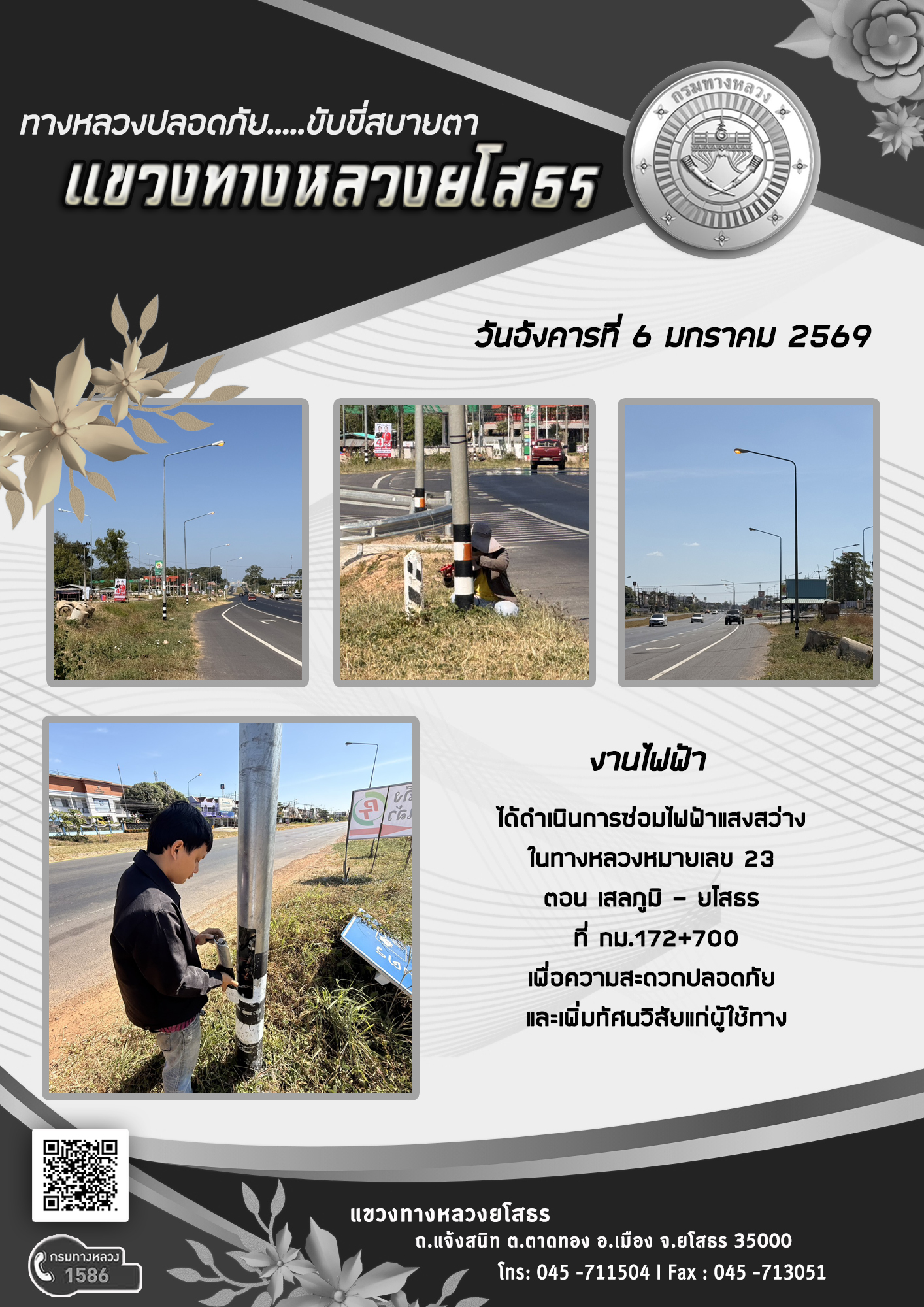 วันอังคารที่ 6 มกราคม 2569 งานไฟฟ้า ได้ดำเนินการซ่อมไฟฟ้าแสงสว่าง ในทางหลวงหมายเลข 23 ตอน เสลภูมิ - ยโสธร ที่ กม.172+700 เพื่อความสะดวกปลอดภัย และเพิ่มทัศนวิสัยแก่ผู้ใช้ทาง
