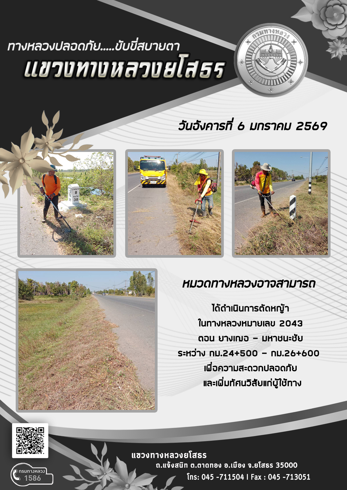 วันอังคารที่ 6 มกราคม 2569 หมวดทางหลวงอาจสามารถ ได้ดำเนินการตัดหญ้า ในทางหลวงหมายเลข 2043 ตอน ยางเฌอ - มหาชนะชัย ระหว่าง กม.24+500 - กม.26+600 เพื่อความสะดวกปลอดภัย และเพิ่มทัศนวิสัยแก่ผู้ใช้ทาง