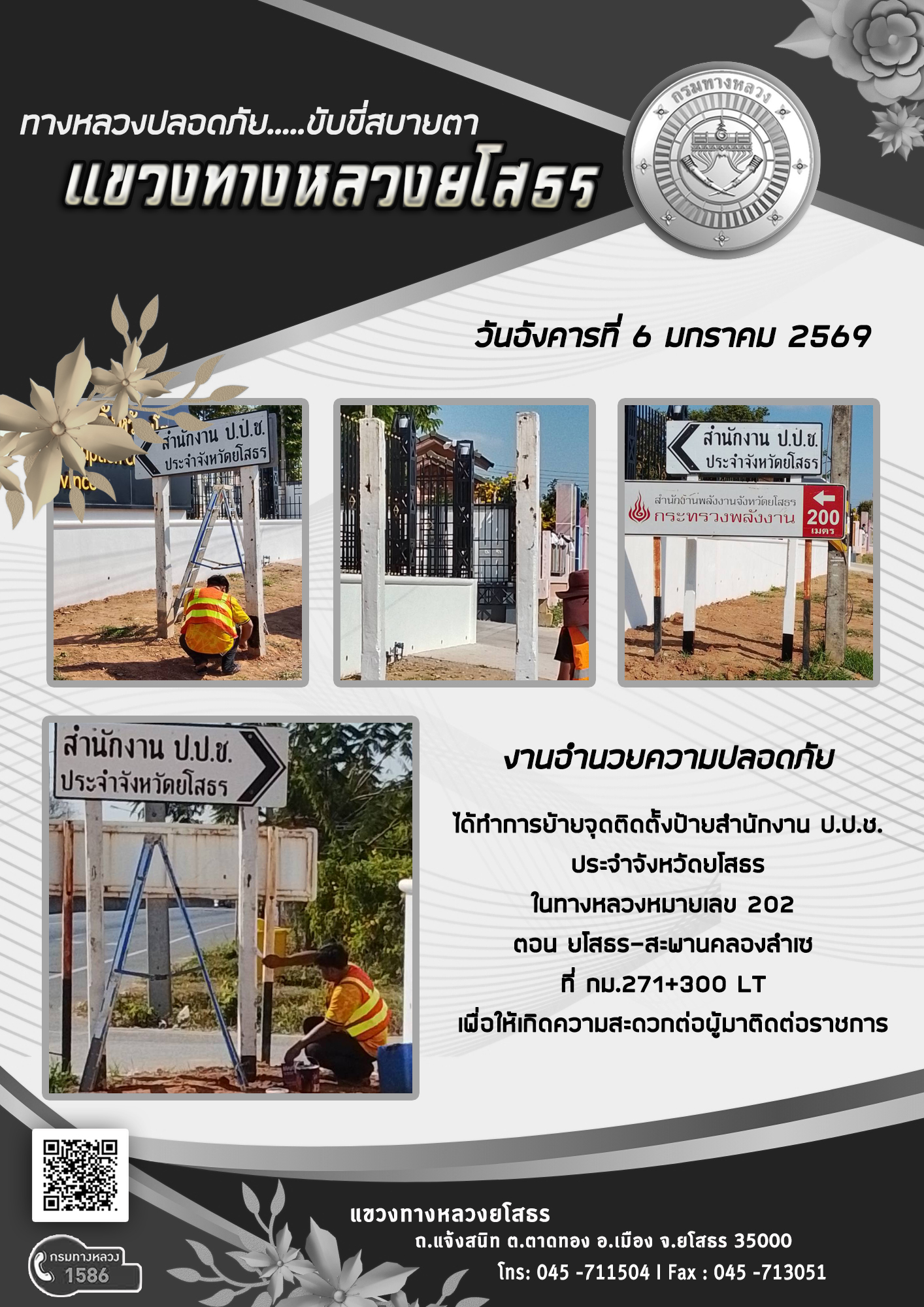วันอังคารที่ 6 มกราคม 2569 งานอำนวยความปลอดภัย ได้ทำการย้ายจุดติดตั้งป้ายสำนักงาน ป.ป.ช. ประจำจังหวัดยโสธร ในทางหลวงหมายเลข 202 ตอน ยโสธร-สะพานคลองลำเซ ที่ กม.271+300 LT เพื่อให้เกิดความสะดวกต่อผู้มาติดต่อราชการ