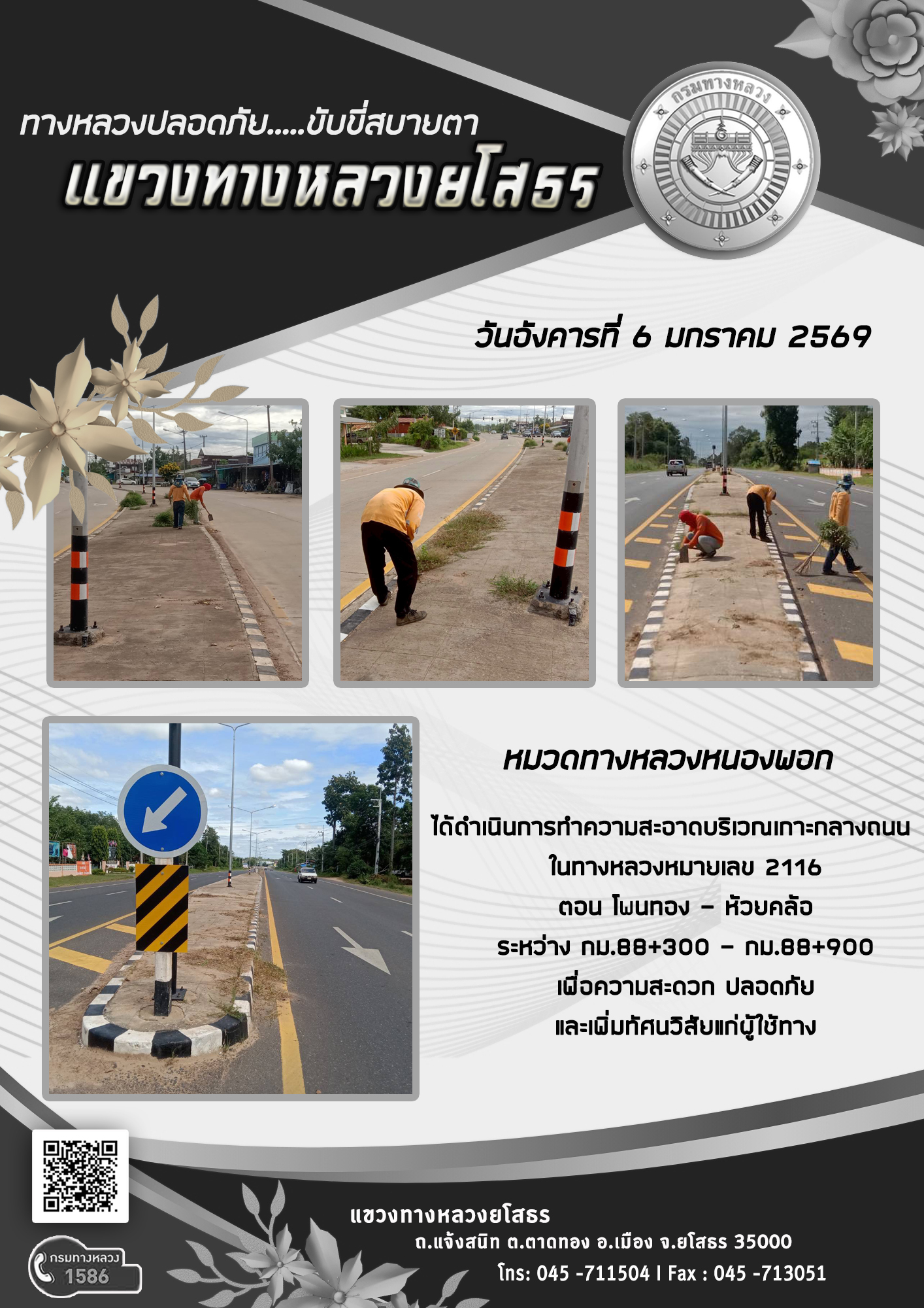วันอังคารที่ 6 มกราคม 2569 หมวดทางหลวงหนองพอก ได้ดำเนินการทำความสะอาดบริเวณเกาะกลางถนน ในทางหลวงหมายเลข 2116 ตอน โพนทอง - หัวยคล้อ ระหว่าง กม.88+300 - กม.88+900 เพื่อความสะดวก ปลอดภัย และเพิ่มทัศนวิสัยแก่ผู้ใช้ทาง