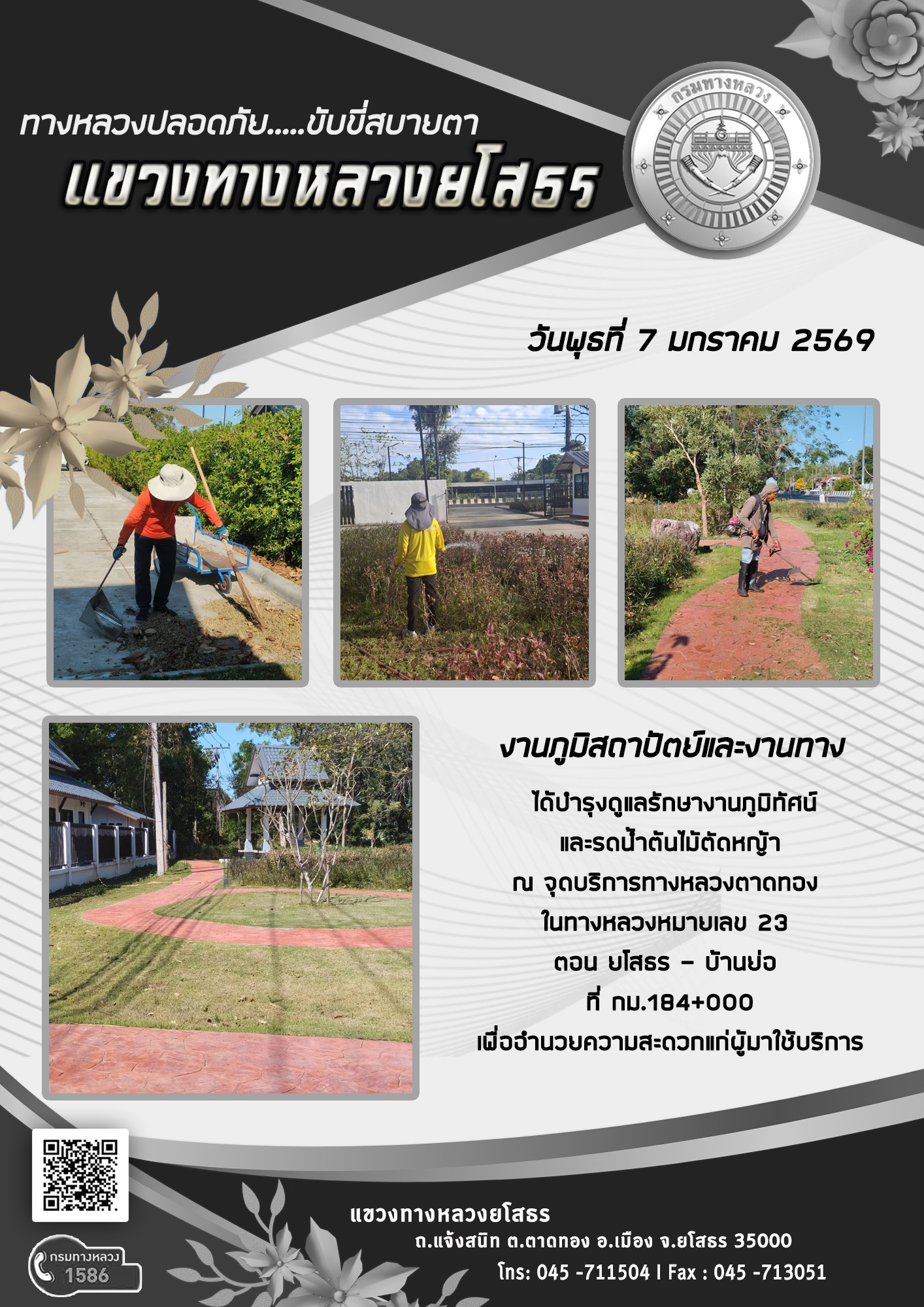 - [10:21] ทั่วไป วันอังคารที่ 31 มีนาคม 2569 งานอำนวยความปลอดภัย ได้ดำเนินการตัดหญ้า ทำความสะอาดภายในบริเวณแขวงทางหลวงยโสธร
