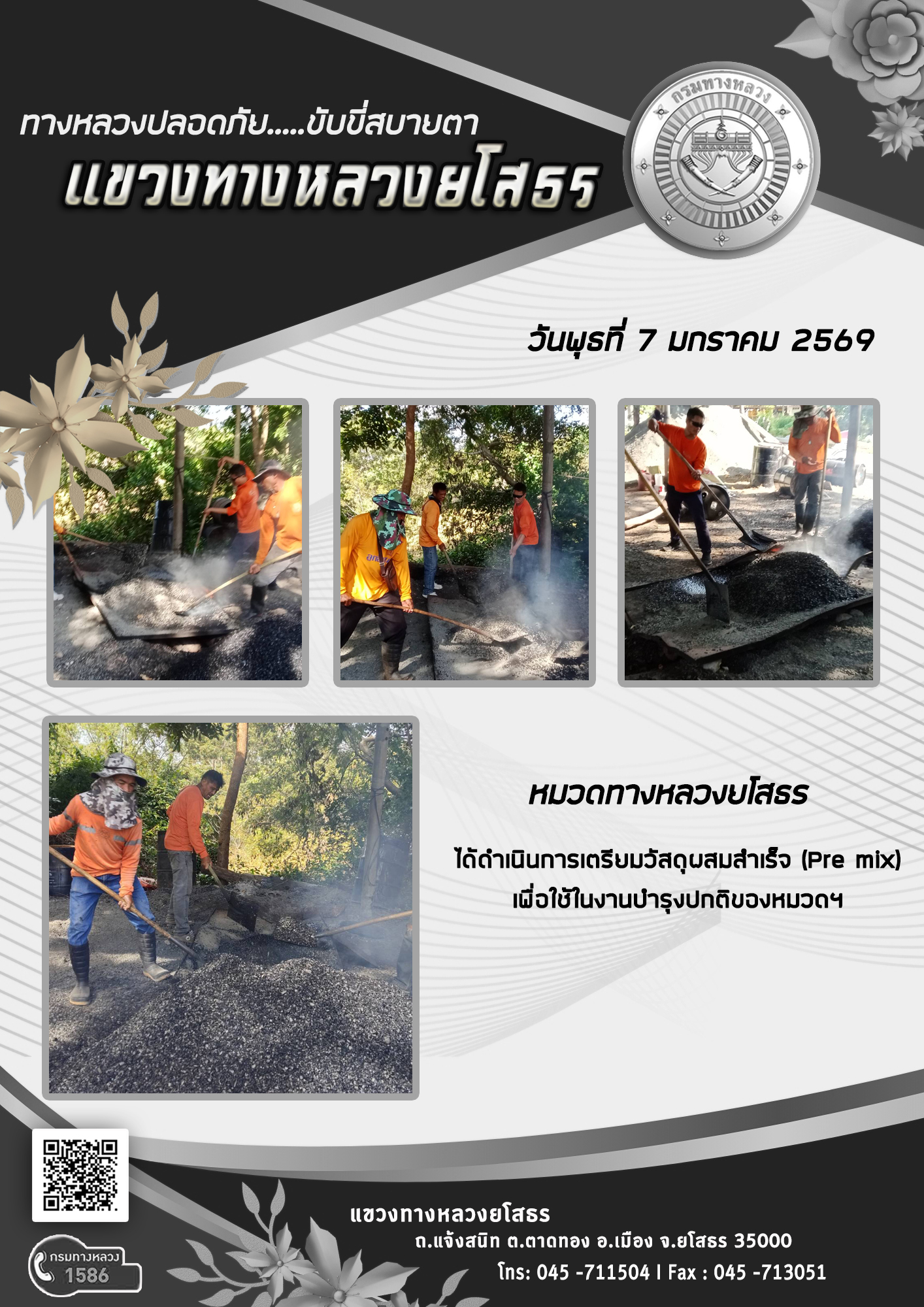 วันพุธที่ 7 มกราคม 2569 หมวดทางหลวงยโสธร ได้ดำเนินการเตรียมวัสดุผสมสำเร็จ (Pre mix) เพื่อใช้ในงานบำรุงปกติของหมวดฯ