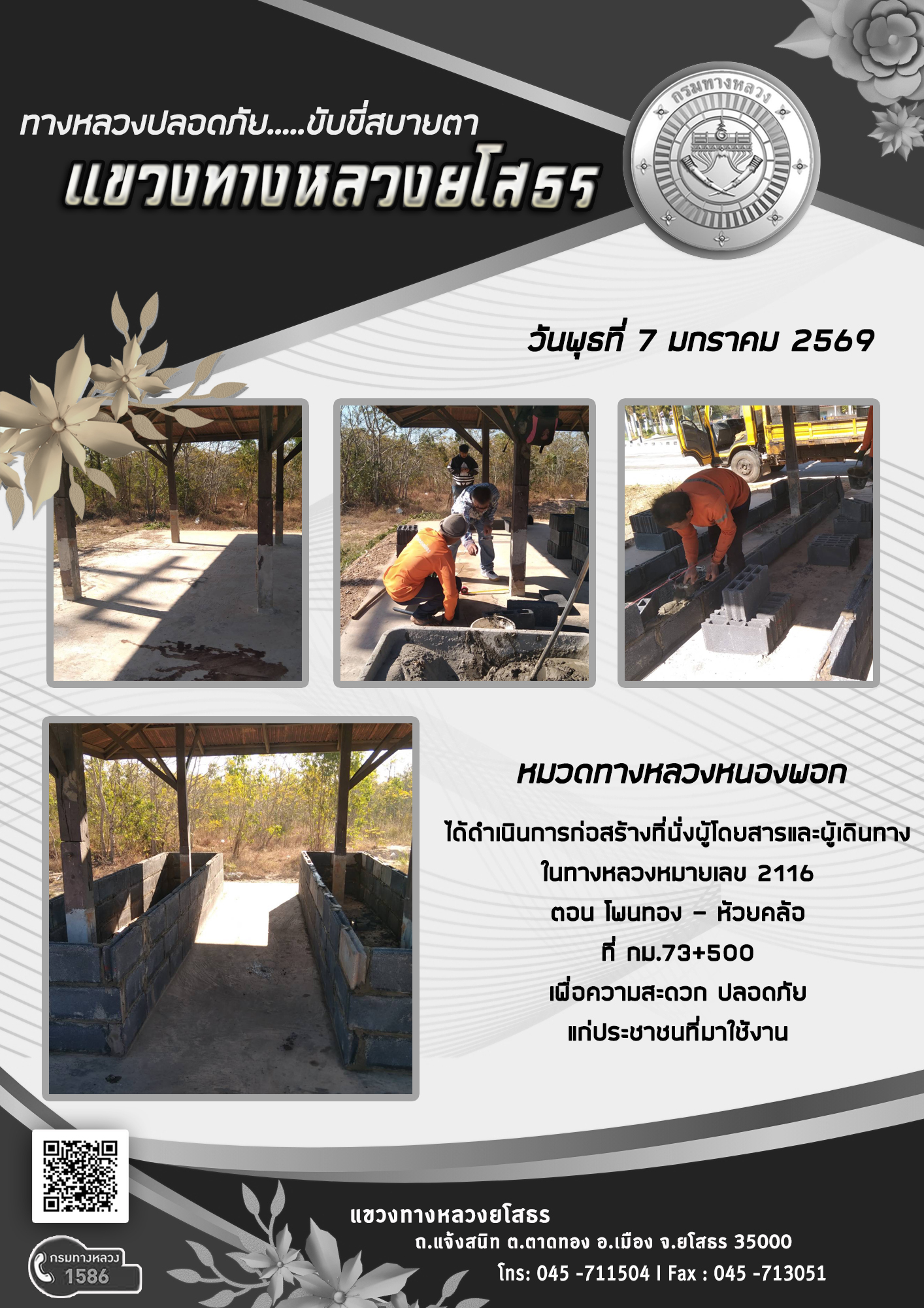 วันพุธที่ 7 มกราคม 2569 หมวดทางหลวงหนองพอก ได้ดำเนินการก่อสร้างที่นั่งผู้โดยสารและผู้เดินทาง ในทางหลวงหมายเลข 2116 ตอน โพนทอง - หัวยคล้อ ที่ กม.73+500 เพื่อความสะดวก ปลอดภัย แก่ประชาชนที่มาใช้งาน
