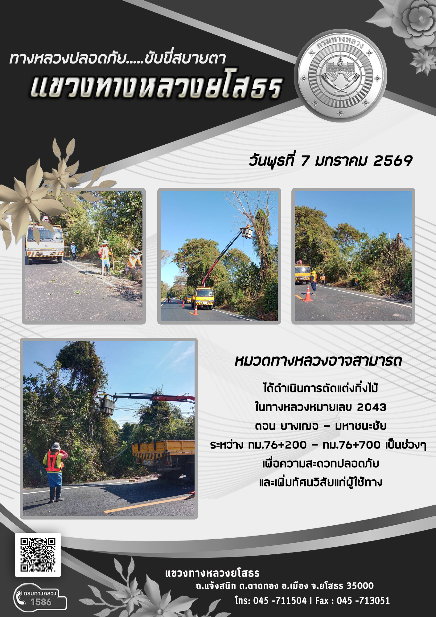 วันพุธที่ 7 มกราคม 2569 หมวดทางหลวงอาจสามารถ ได้ดำเนินการตัดแต่งกิ่งไม้ ในทางหลวงหมายเลข 2043 ตอน ยางเฌอ - มหาชนะชัย ระหว่าง กม.76+200 - กม.76+700 เป็นช่วงๆ เพื่อความสะดวกปลอดภัย และเพิ่มทัศนวิสัยแก่ผู้ใช้ทาง