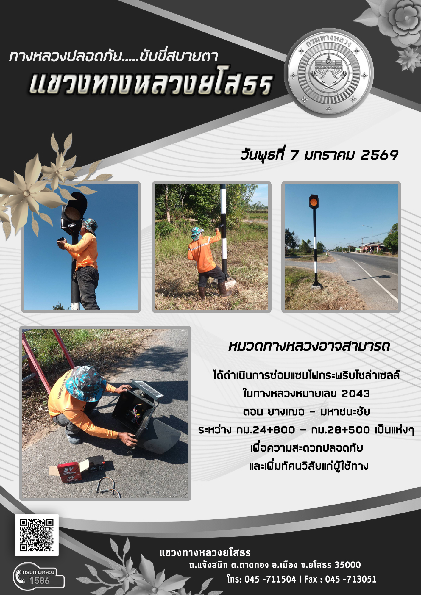 วันพุธที่ 7 มกราคม 2569 หมวดทางหลวงอาจสามารถ ได้ดำเนินการซ่อมแซมไฟกระพริบโซล่าเซลล์ ในทางหลวงหมายเลข 2043 ตอน ยางเฌอ - มหาชนะชัย ระหว่าง กม.24+800 - กม.28+500 เป็นแห่งๆ เพื่อความสะดวกปลอดภัย และเพิ่มทัศนวิสัยแก่ผู้ใช้ทาง