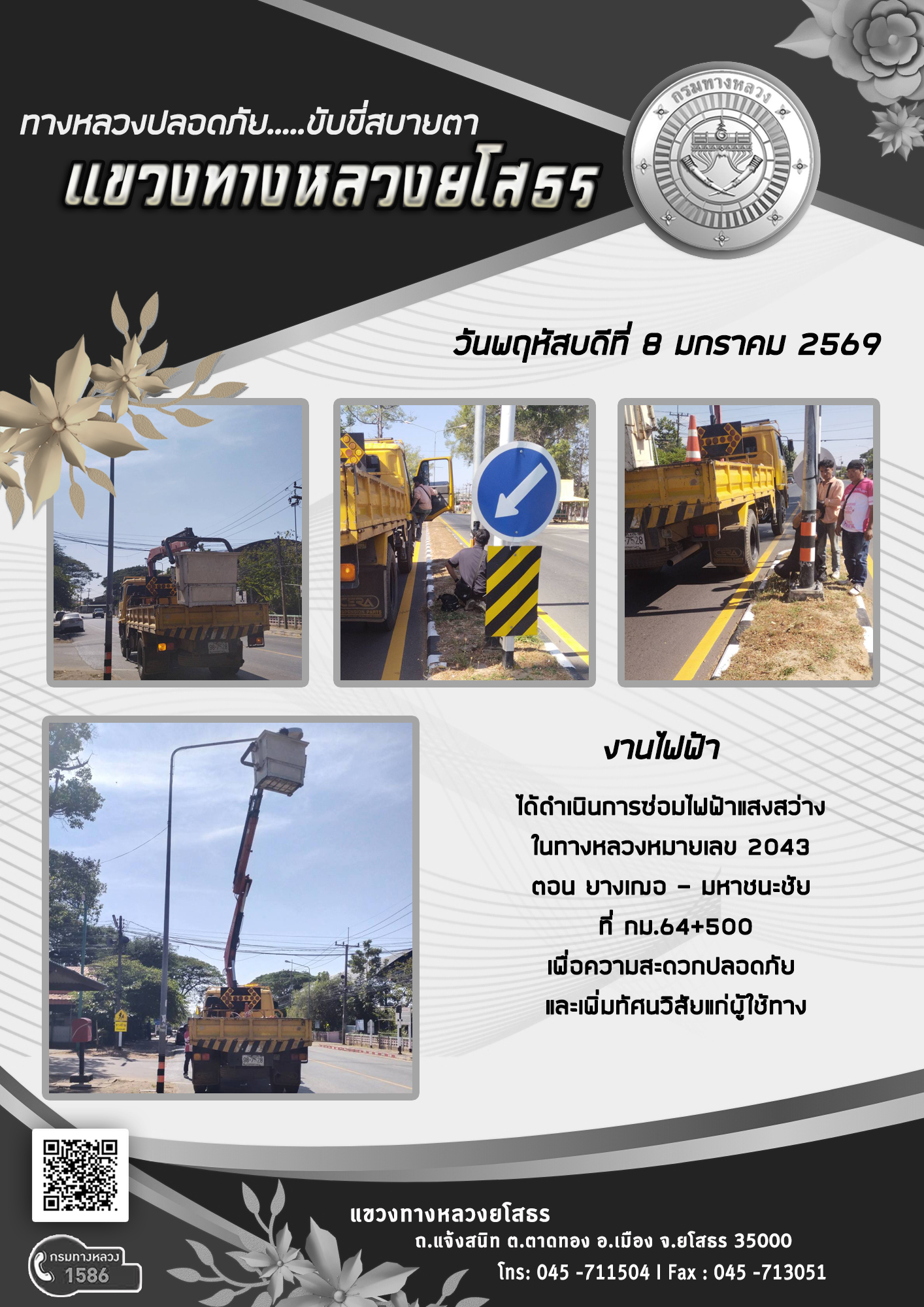 วันพฤหัสบดีที่ 8 มกราคม 2569 งานไฟฟ้า ได้ดำเนินการซ่อมไฟฟ้าแสงสว่าง ในทางหลวงหมายเลข 2043 ตอน ยางเฌอ - มหาชนะชัย ที่ กม.64+500 เพื่อความสะดวกปลอดภัย และเพิ่มทัศนวิสัยแก่ผู้ใช้ทาง