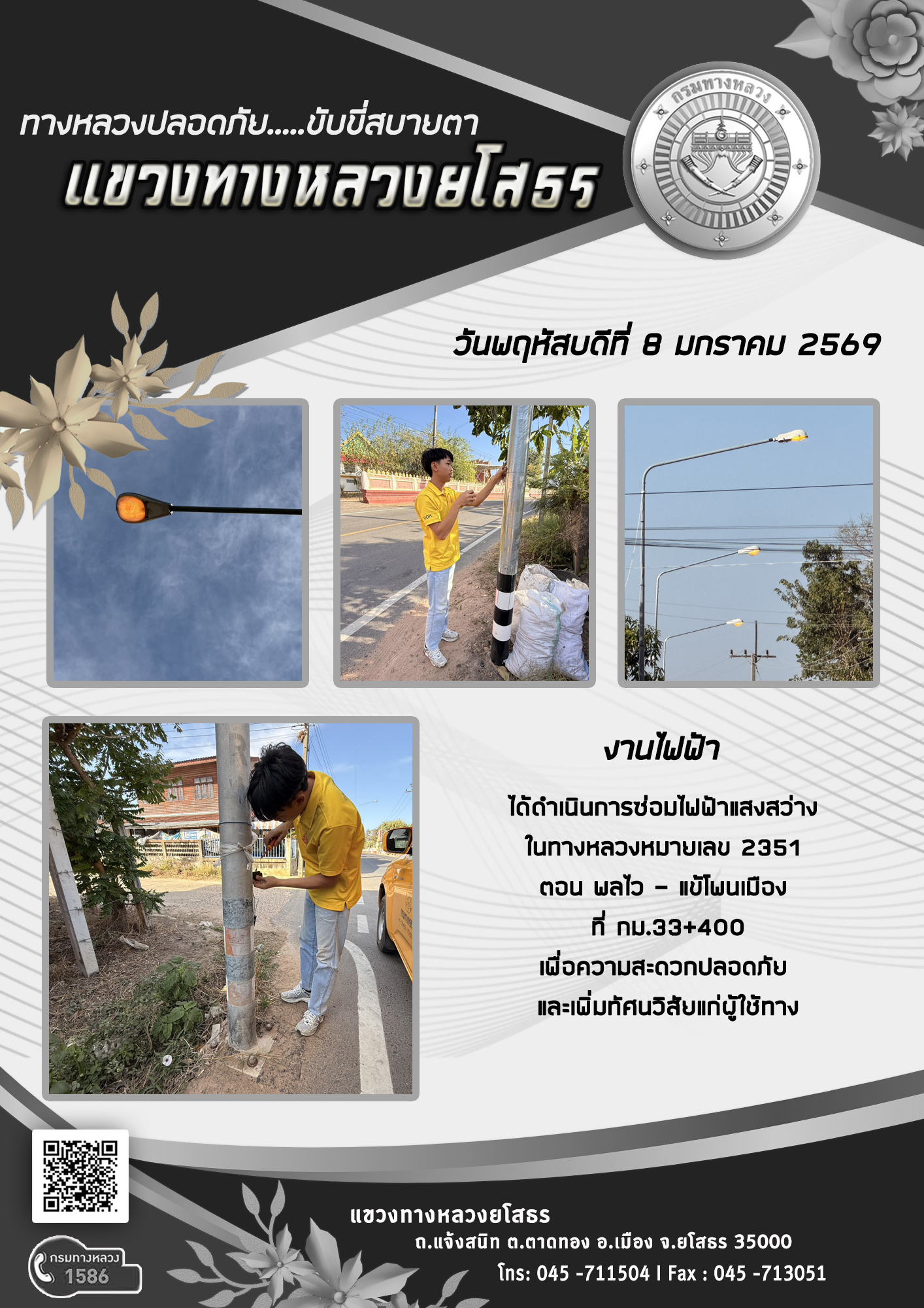 วันพฤหัสบดีที่ 8 มกราคม 2569 งานไฟฟ้า ได้ดำเนินการซ่อมไฟฟ้าแสงสว่าง ในทางหลวงหมายเลข 2351 ตอน พลไว - แข้โพนเมือง ที่ กม.33+400 เพื่อความสะดวกปลอดภัย และเพิ่มทัศนวิสัยแก่ผู้ใช้ทาง