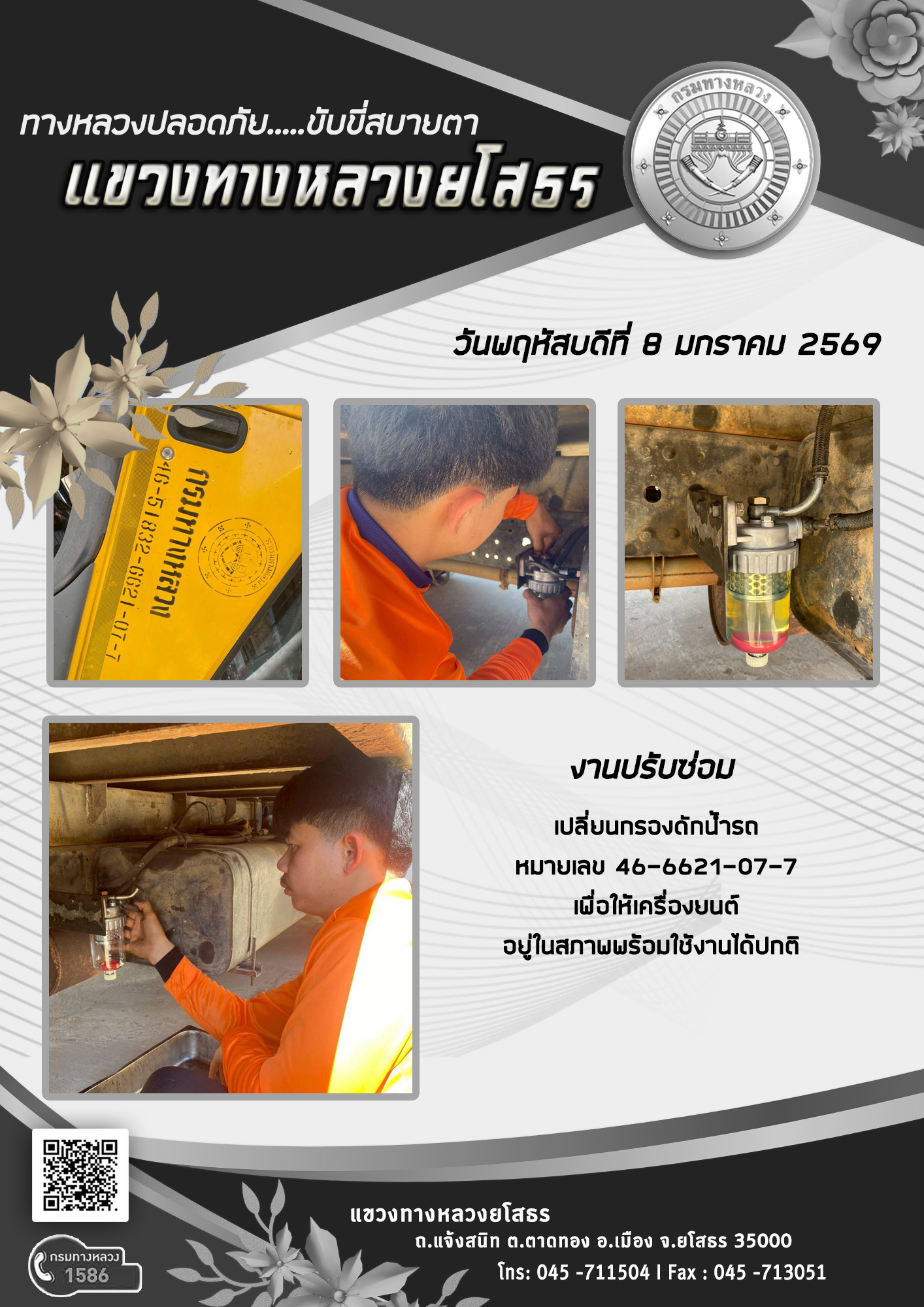 วันพฤหัสบดีที่ 8 มกราคม 2569 งานปรับซ่อม เปลี่ยนกรองดักน้ำ รถหมายเลข 46-6621-07-7 เพื่อให้เครื่องยนต์ อยู่ในสภาพพร้อมใช้งานได้ปกติ