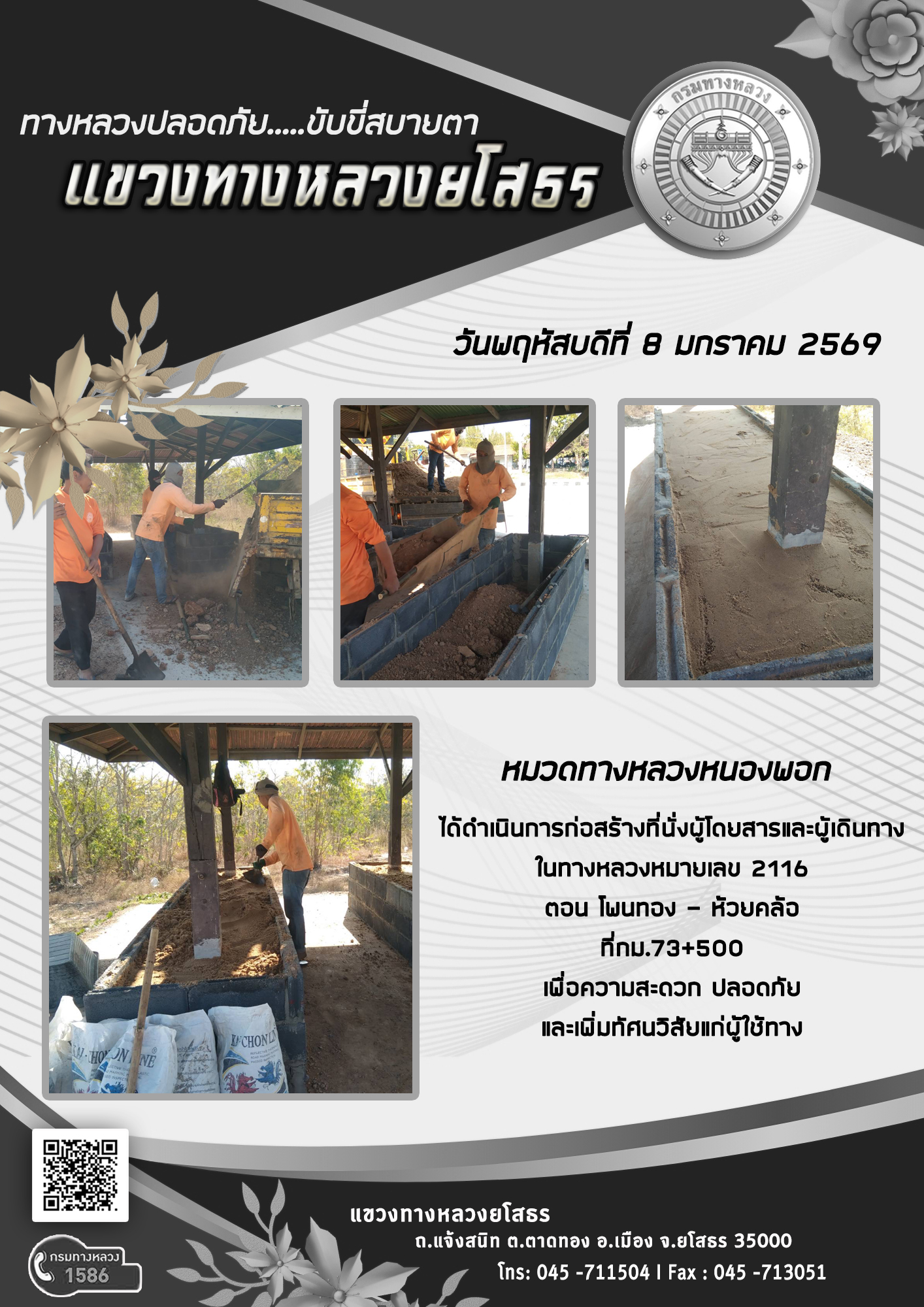 วันพฤหัสบดีที่ 8 มกราคม 2569 หมวดทางหลวงหนองพอก ได้ดำเนินการก่อสร้างที่นั่งผู้โดยสารและผู้เดินทาง ในทางหลวงหมายเลข 2116 ตอน โพนทอง - หัวยคล้อ ที่ กม.73+500 เพื่อความสะดวก ปลอดภัย และเพิ่มทัศนวิสัยแก่ผู้ใช้ทาง