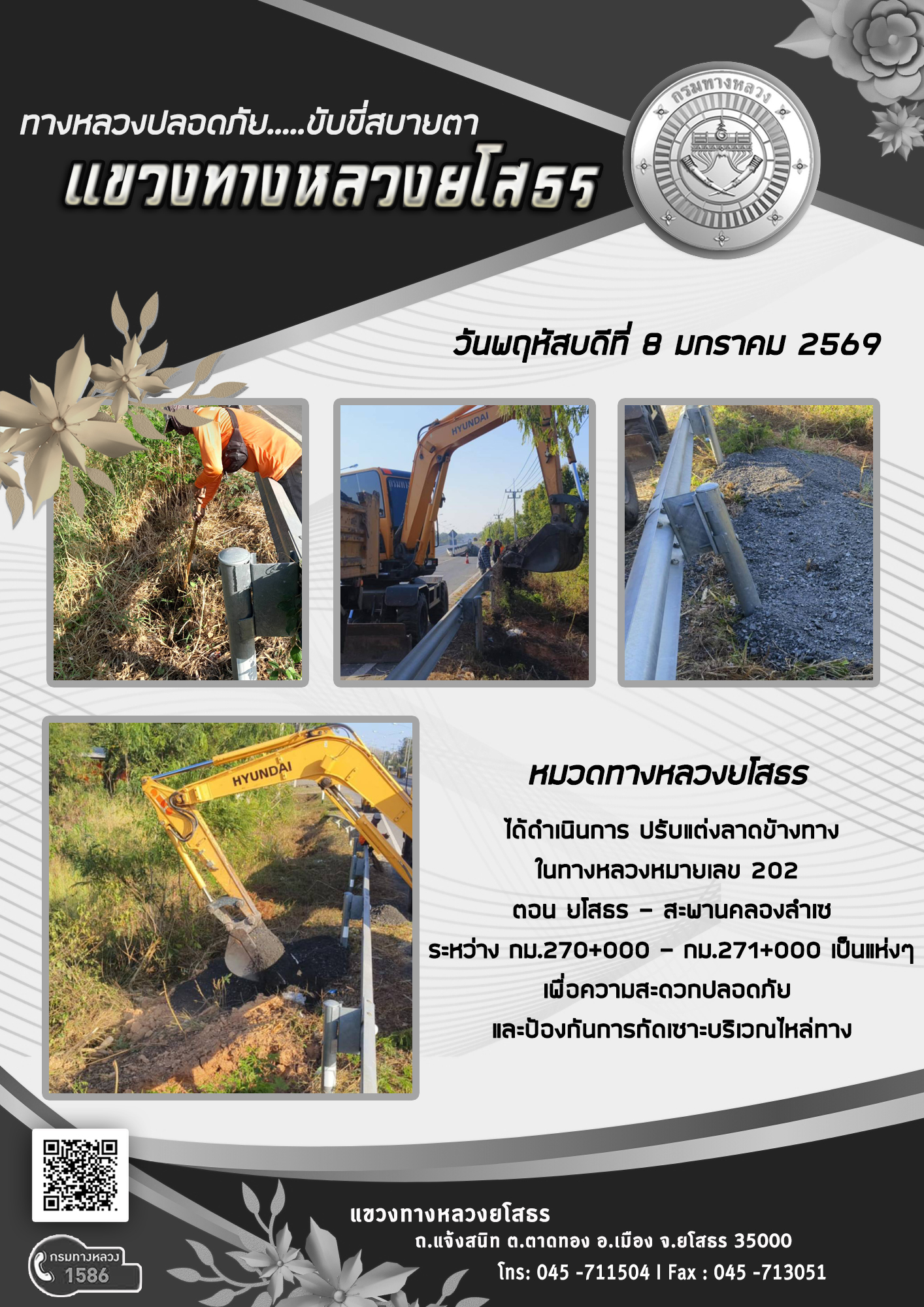 วันพฤหัสบดีที่ 8 มกราคม 2569 หมวดทางหลวงยโสธร ได้ดำเนินการ ปรับแต่งพื้นข้างทาง ในทางหลวงหมายเลข 202 ตอน ยโสธร - สะพานคลองลำเซ ระหว่าง กม.270+000 - กม.271+000 เป็นแห่งๆ เพื่อความสะดวกปลอดภัย และป้องกันการกัดเซาะบริเวณไหล่ทาง