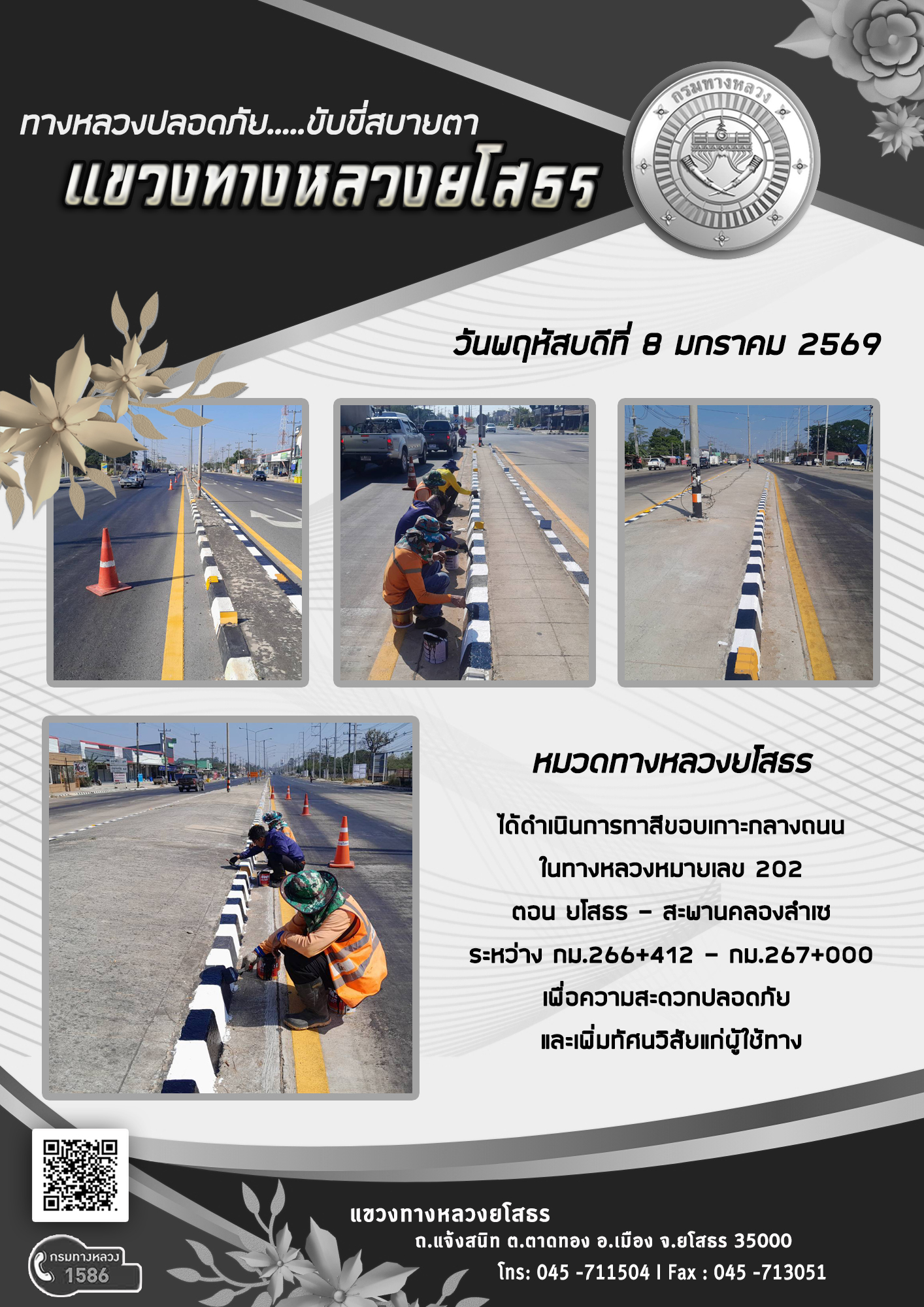 วันพฤหัสบดีที่ 8 มกราคม 2569 หมวดทางหลวงยโสธร ได้ดำเนินการทาสีขอบเกาะกลางถนน ในทางหลวงหมายเลข 202 ตอน ยโสธร - สะพานคลองลำเซ ระหว่าง กม.266+412 - กม.267+000 เพื่อความสะดวกปลอดภัย และเพิ่มทัศนวิสัยแก่ผู้ใช้ทาง
