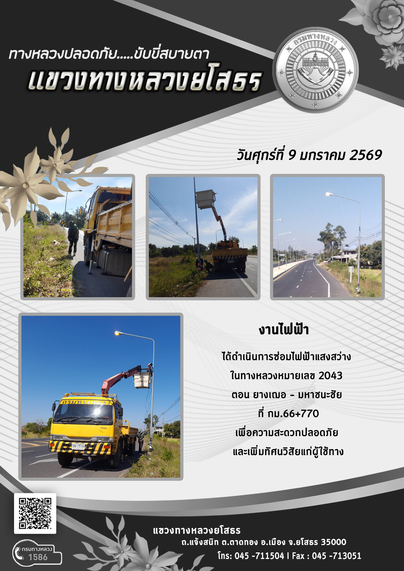วันศุกร์ที่ 9 มกราคม 2569 งานไฟฟ้า ได้ดำเนินการซ่อมไฟฟ้าแสงสว่าง ในทางหลวงหมายเลข 2043 ตอน ยางเฌอ - มหาชนะชัย ที่ กม.66+770 เพื่อความสะดวกปลอดภัย และเพิ่มทัศนวิสัยแก่ผู้ใช้ทาง