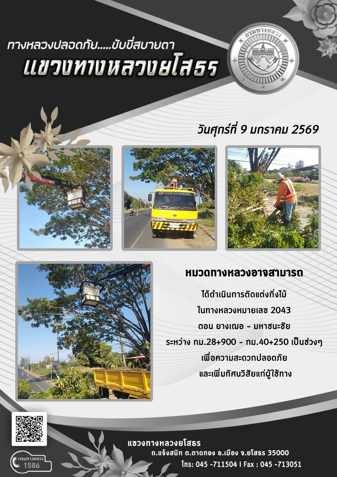 วันศุกร์ที่ 9 มกราคม 2569 หมวดทางหลวงอาจสามารถ ได้ดำเนินการตัดแต่งกิ่งไม้ ในทางหลวงหมายเลข 2043 ตอน ยางเฌอ - มหาชนะชัย ระหว่าง กม.28+900 - กม.40+250 เป็นช่วงๆ เพื่อความสะดวกปลอดภัย และเพิ่มทัศนวิสัยแก่ผู้ใช้ทาง